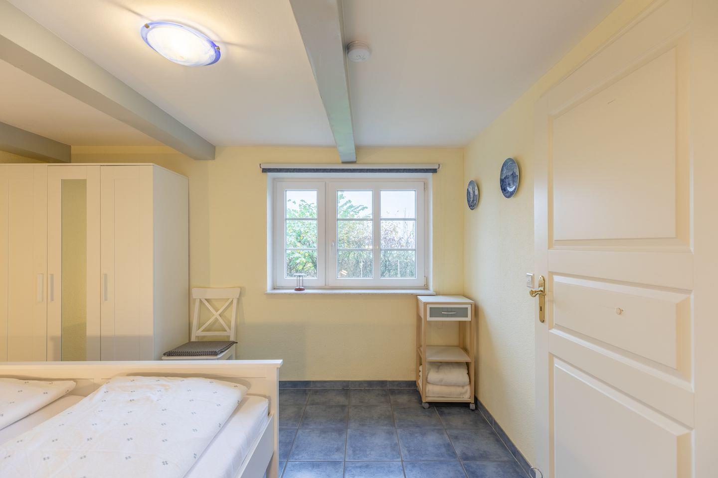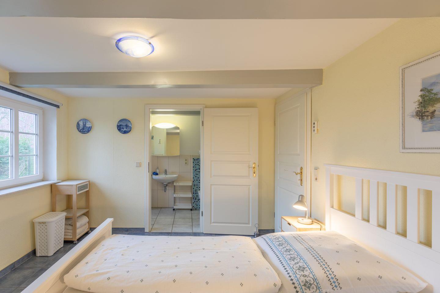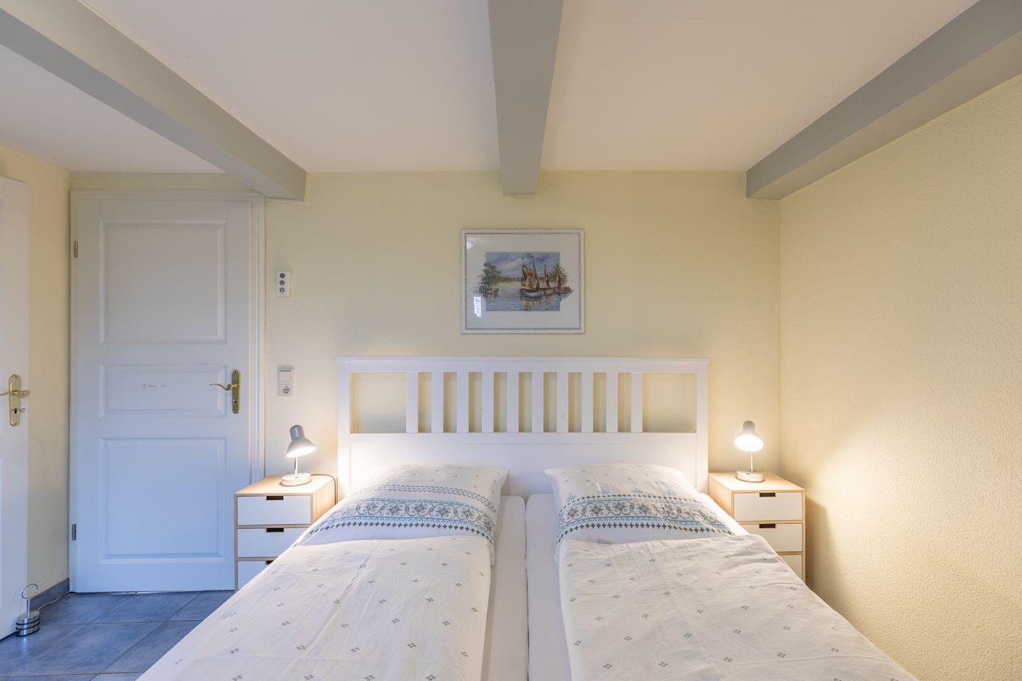 Das 150 qm große Ferienhaus bietet drei Schlafzimmer mit Platz für max. 6 Erwachsene. Das Schlafzimmer „Deichblick“ im EG mit einem 180 cm breiten Doppelbett und direktem Zugang zum Duschbad, das 2. Schlafzimmer im Apartment mit zwei Einzelbetten (90 × 200) und das „Blaue-Zimmer“ mit zwei Einzelbetten (90 × 200).