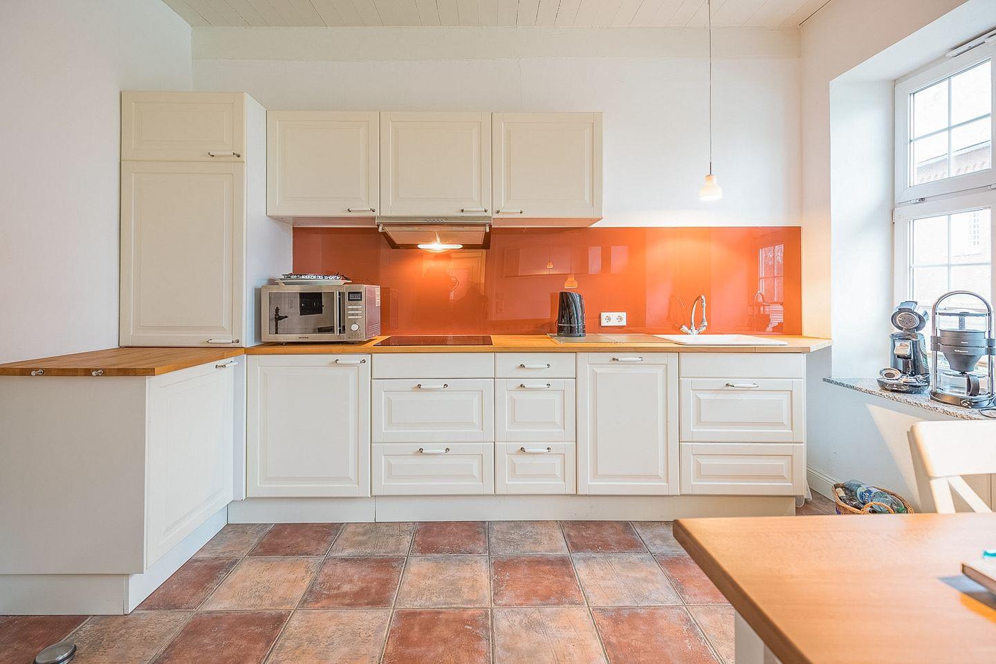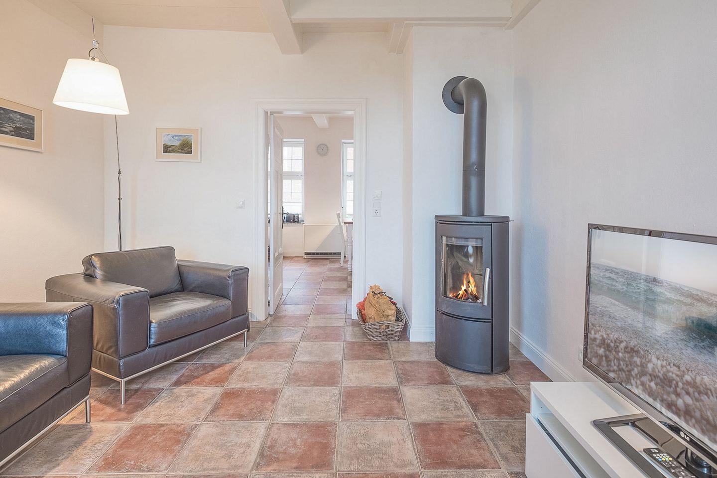 Die kleine gemütliche Wohnung bietet Ihnen ein helles Wohnzimmer mit Kaminofen und großem Flachbild-TV für gemütliches Stunden. Die separate Küche ist komfortabel ausgestattet: Essbereich, ein 4-Zonen Cerankochfeld, Mikrowelle mit Backofenfunktion, Kühlschrank mit Gefrierfach, Geschirrspüler, Filter-Kaffeemaschine, Senseo, Toaster und Wasserkocher.