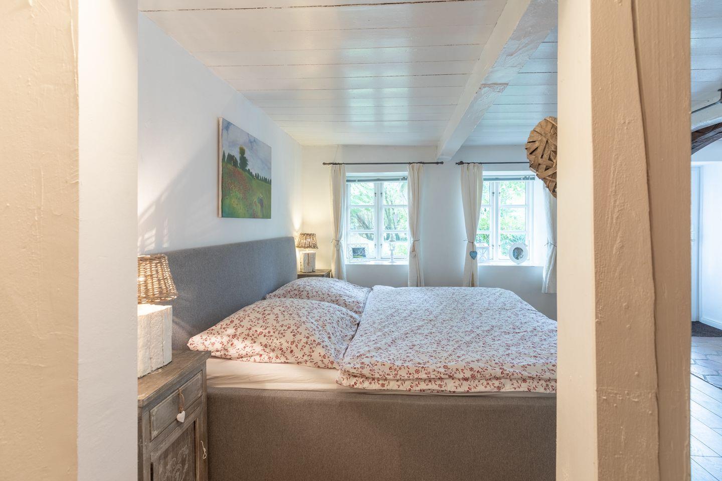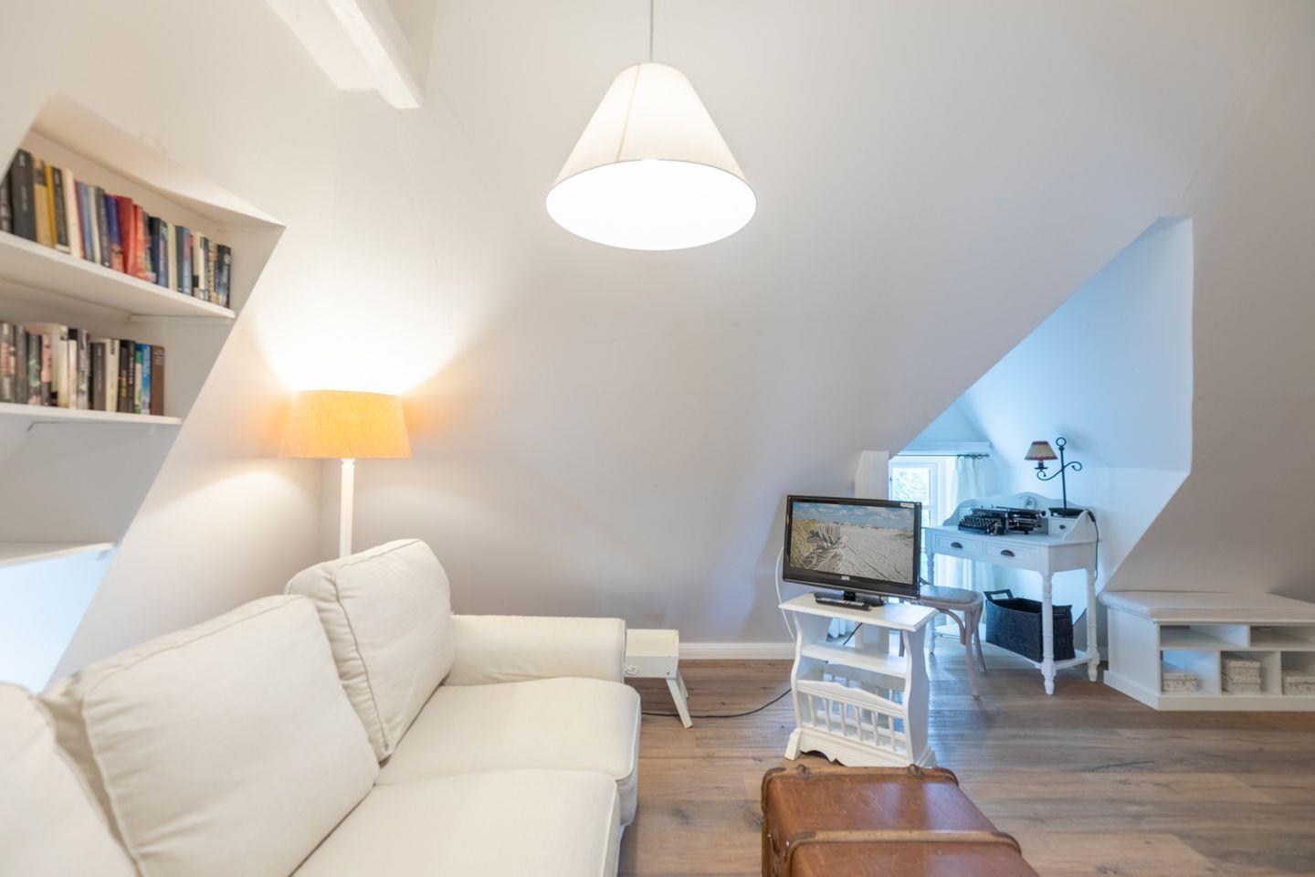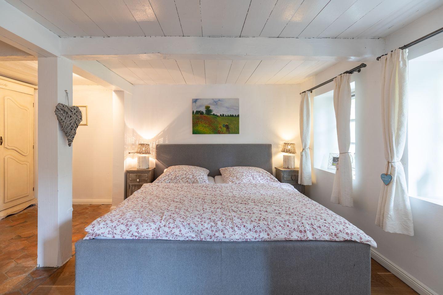 Das 140 qm große Ferienhaus wurde im klassischen Landhausstil eingerichtet und bietet Platz für bis zu 6 Personen. Zwei Schlafzimmer befinden sich im Obergeschoss: eines mit einem Doppelbett (180 x 200 m) und einem gemütlichen Sofa und TV als Rückzugsort und ein weiteres mit zwei Einzelbetten, das sich für Kinder und junge Erwachsene hervorragend eignet. Ebenso befindet sich auf dieser Etage ein kleines Duschbad mit WC.
