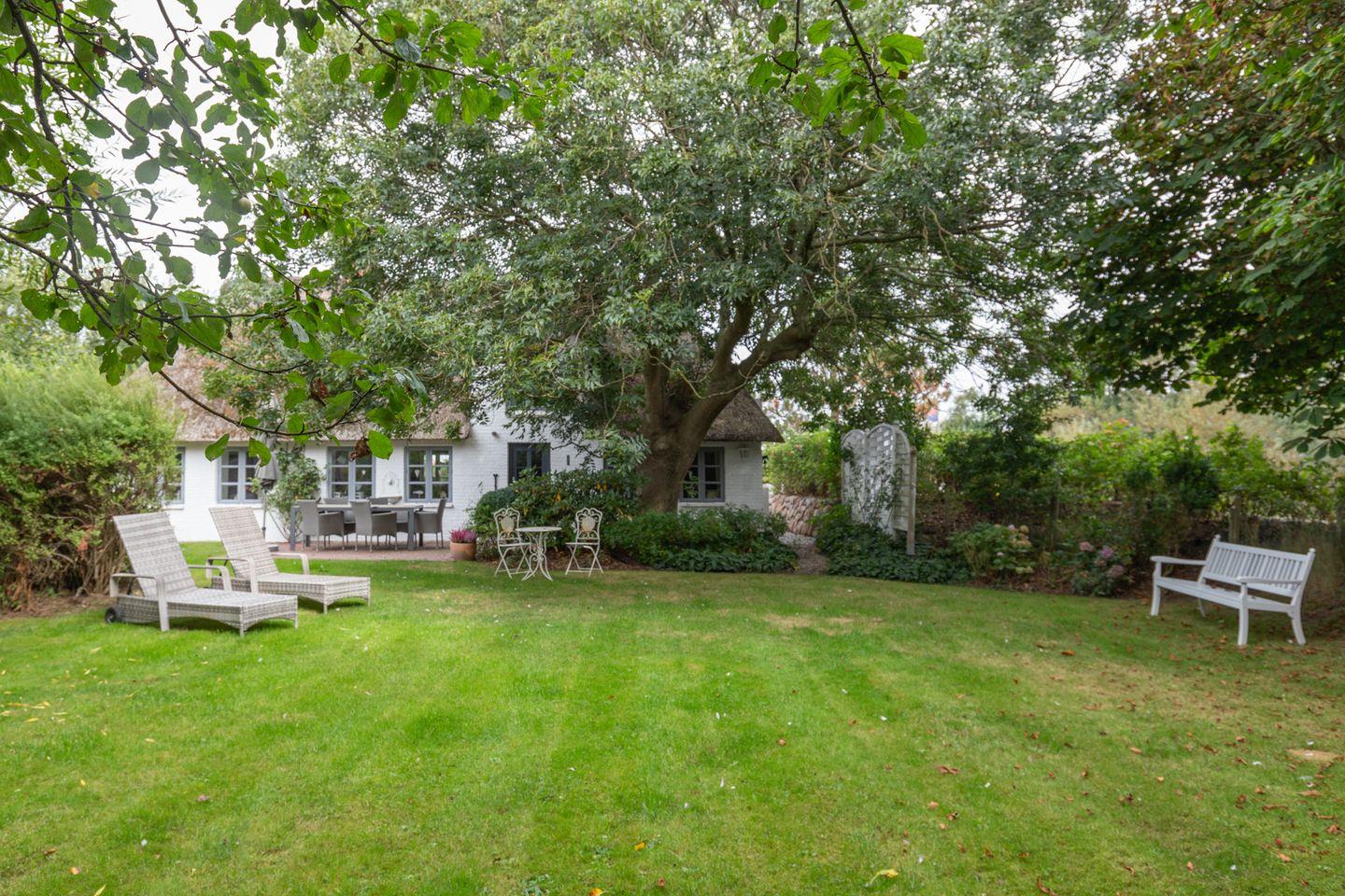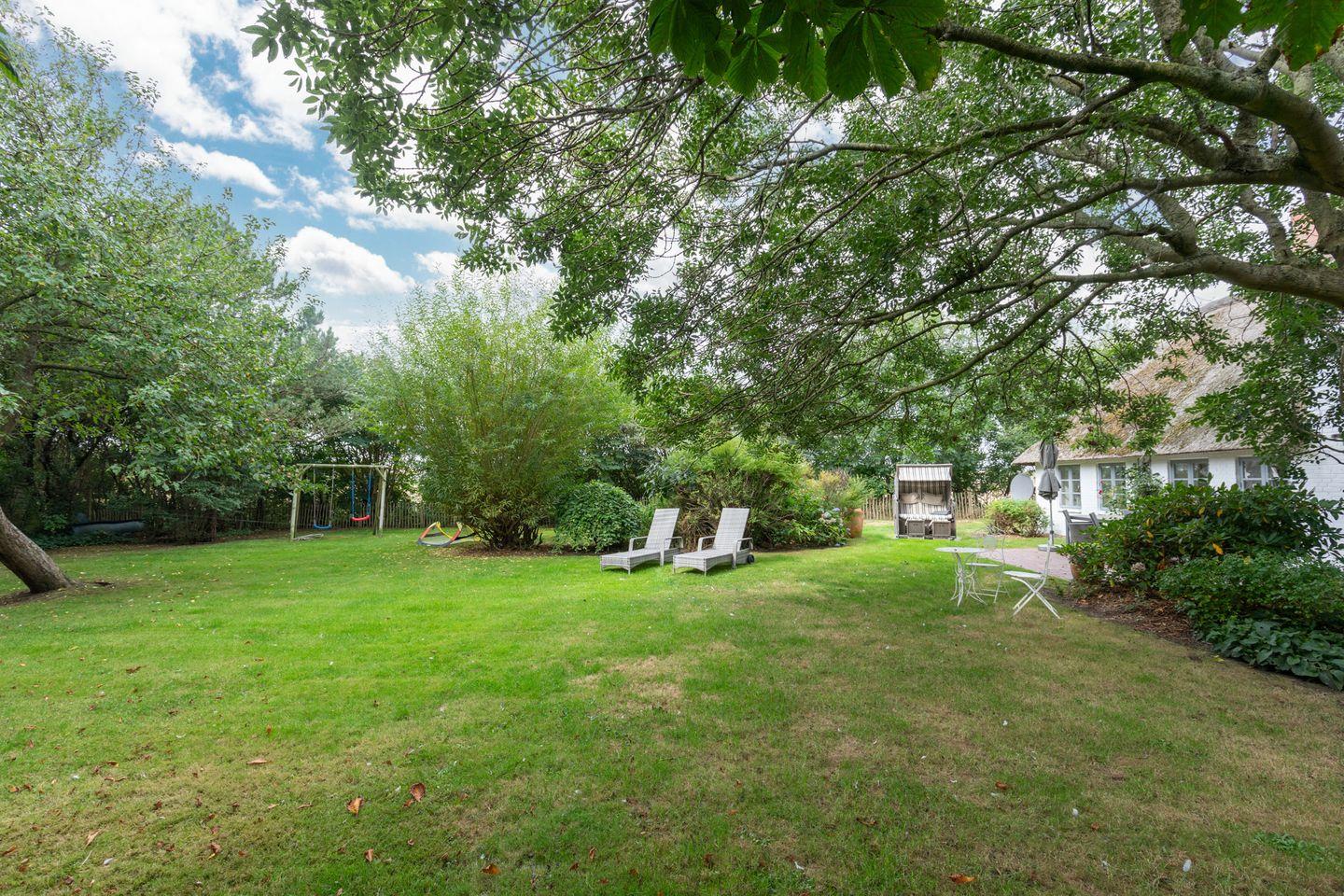 Auf der sonnigen Terrasse mit den Gartenmöbeln, zwei Strandkörben und einem Grill können Sie den Tag entspannt ausklingen lassen.