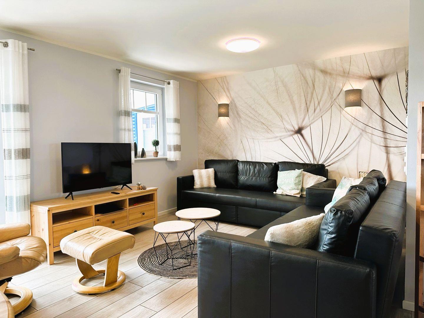 Im Wohnzimmer des Hauses befindet sich eine Schlafcouch, die zusätzlichen Schlafplatz für zwei Gäste bietet. Der Raum ist liebevoll gestaltet und bietet Ihnen eine gemütliche Atmosphäre, in der Sie sich entspannen und den Abend ausklingen lassen können.