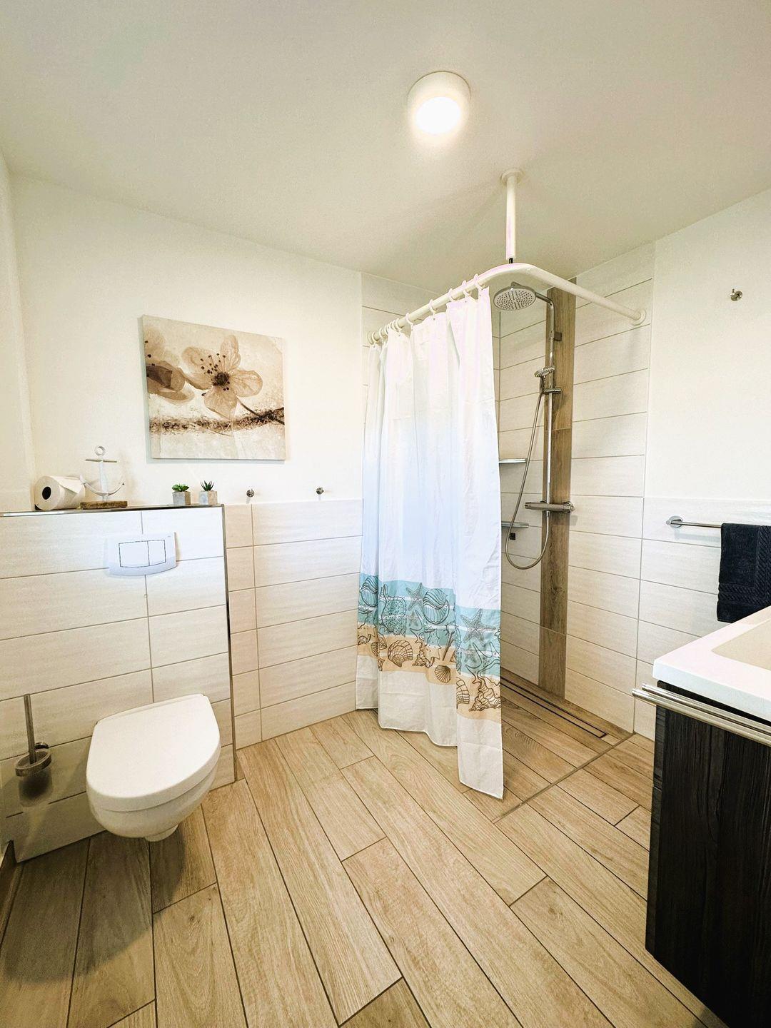 Der große Flur des Ferienhauses beherbergt einen Kicker Tisch und eine elektrische Dartscheibe, die zu unterhaltsamen Spielen und geselligen Abenden einladen. Hier ist genügend Platz für Aktivitäten und gemeinsame Zeit mit der Familie oder Freunden.