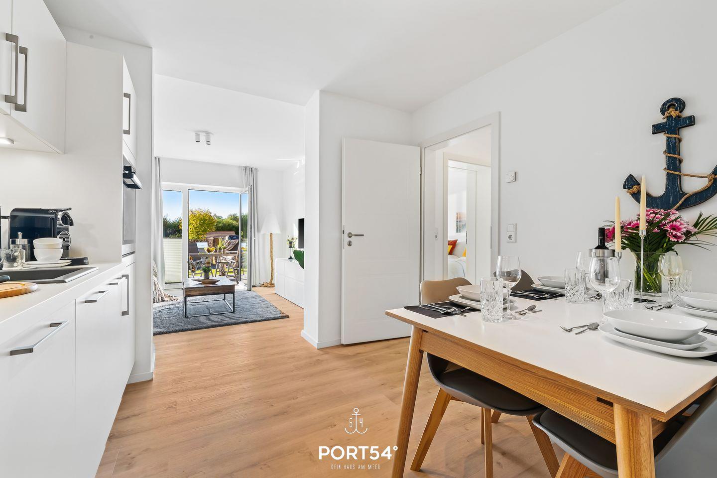 Im geräumigen Wohnzimmer können Sie es sich gemütlich machen. Die Küche ist modern und voll ausgestattet, sodass Sie hier wunderbar gemeinsam kochen können. Das Schlafzimmer ist hochwertig eingerichtet und verfügt über ein Doppelbett (180x200cm). Für weitere 2 Personen steht im Wohnzimmer ein gemütliches Schlafsofa zur Verfügung. Das helle Duschbad ist, wie die gesamte Wohnung, mit einer Fußbodenheizung ausgestattet und bietet Ihnen zusätzlichen Komfort. Auf der Sonnenterrasse mit einem Gemeinschaftsgarten können Sie herrliche Stunden an der frischen Nordseeluft verbringen. Für gesellige Grillabende steht Ihnen ein Elektrogrill zur Verfügung.