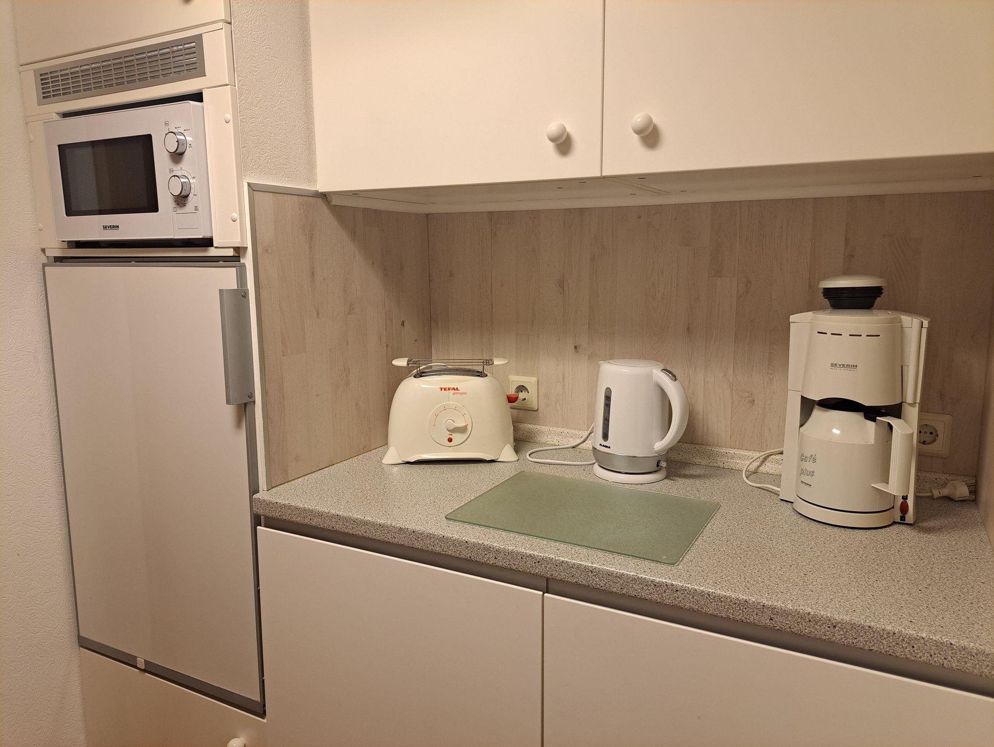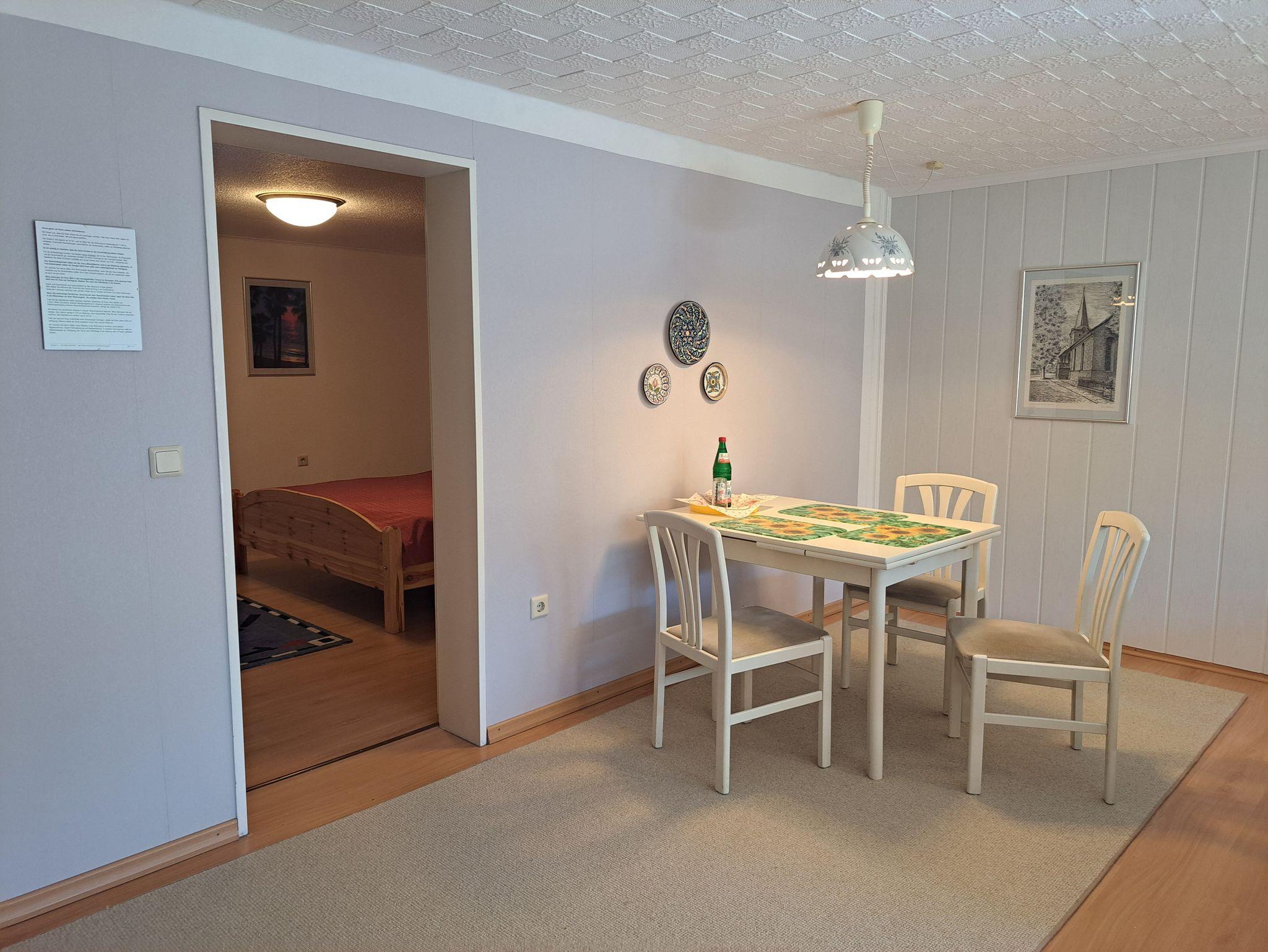 Die 2-Raum-Wohnung (65 qm) verfügt über ein Schlafzimmer mit Doppelbett. Für einen weitere Übernachtungsgast steht im seperaten Wohnzimmer ein Schrankbett zur Verfügung.