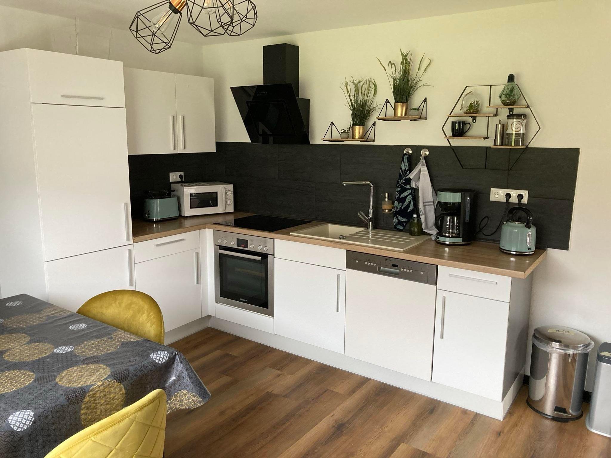 Über den kleinen Flur gelangen Sie in die modern eingerichtete Küche. Mit Geschirrspüler, Kühl-Gefrierkombination, Microwelle, Kaffeemaschine und Co. bieten wir Ihnen einen angenehmen Komfort. Vom Esstisch aus blicken Sie direkt in den Garten.