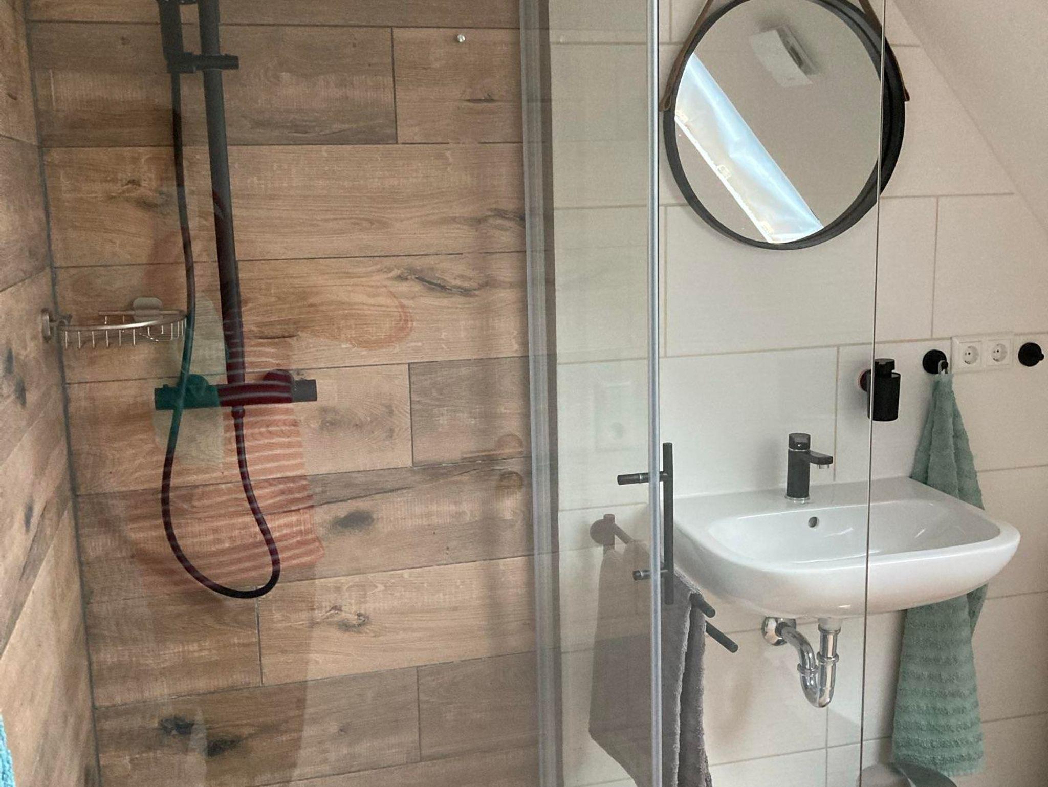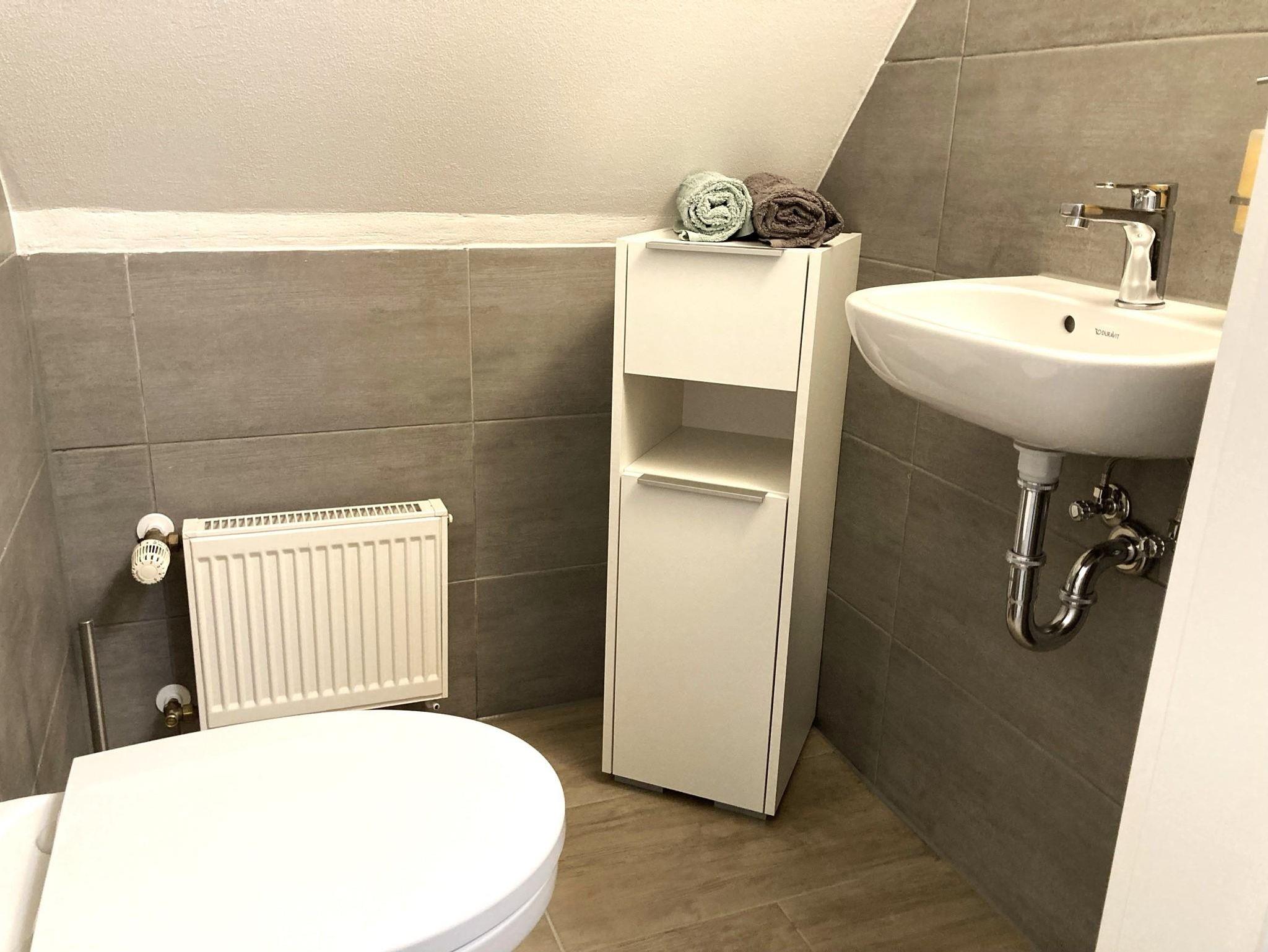 Neben dem Badezimmer in Holzoptik mit einer großen Dusche (Abm.: 120 x 90 cm) befindet sich ein kleines Gäste-WC.