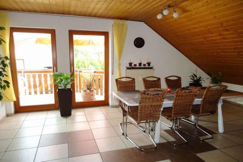 Es gibt einen Kaminofen für schöne Abende mit Feuerschein, 3 Doppelzimmer und zwei Betten im Wohnzimmer auch als Sofa nutzbar. Je Bett berechnen wir zwischen 25,00 Euro und 30,00 Euro die Nacht. Wir legen Wert auf eine Nichtraucherwohnung, daher haben Raucher die Möglichkeit auf dem Balkon mit herrlichem Weitblick oder unter dem überdachten Eingangsbereich mit Sitzgelegenheit zu Rauchen. Die Ferienwohnung hat einen Kaminofen, Spülmaschine, Backofen mit Induktionskochfeld und TV-Flachbildschirm. Das moderne Bad ist mit Dusche und WC ausgestattet Wir freuen uns auf Sie!