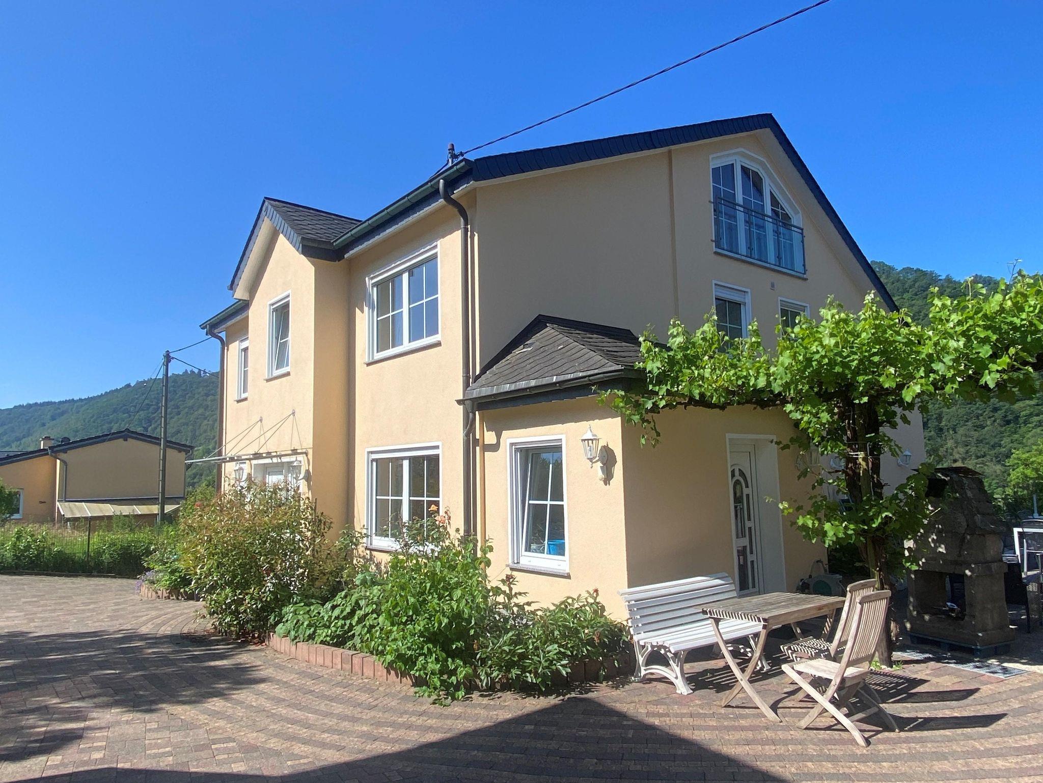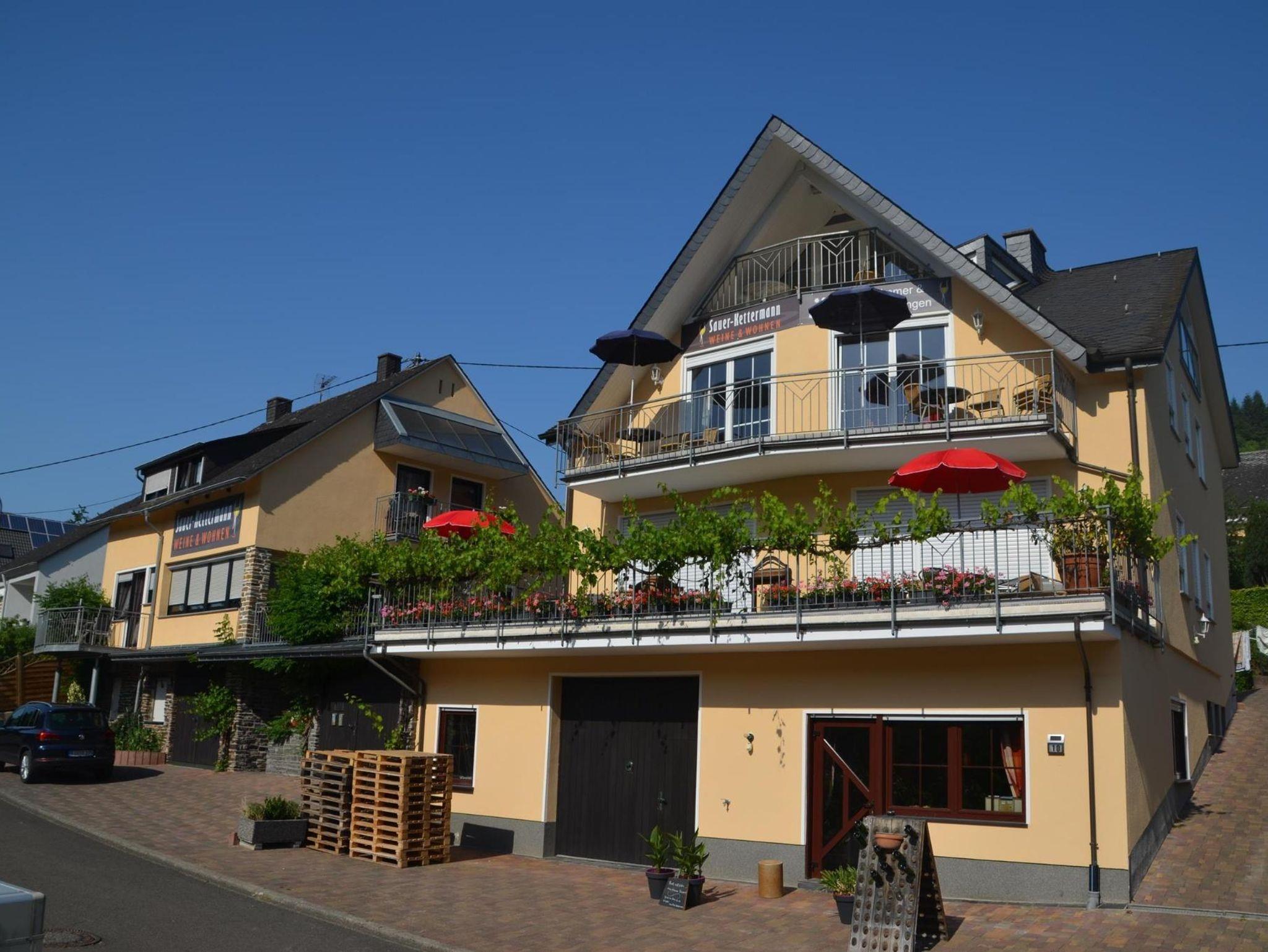 Neubau in sonniger Lage im Rebengrün. 3 komfortable 4-Sterne-Fewo's mit Balkon, Moselblick, gr. Terrasse, gr. Spielplatz, Grillmöglichkeit u. Liegewiese im geräumigen Innengelände. Kellerbesichtigung, Wein- u. Sektprobe.