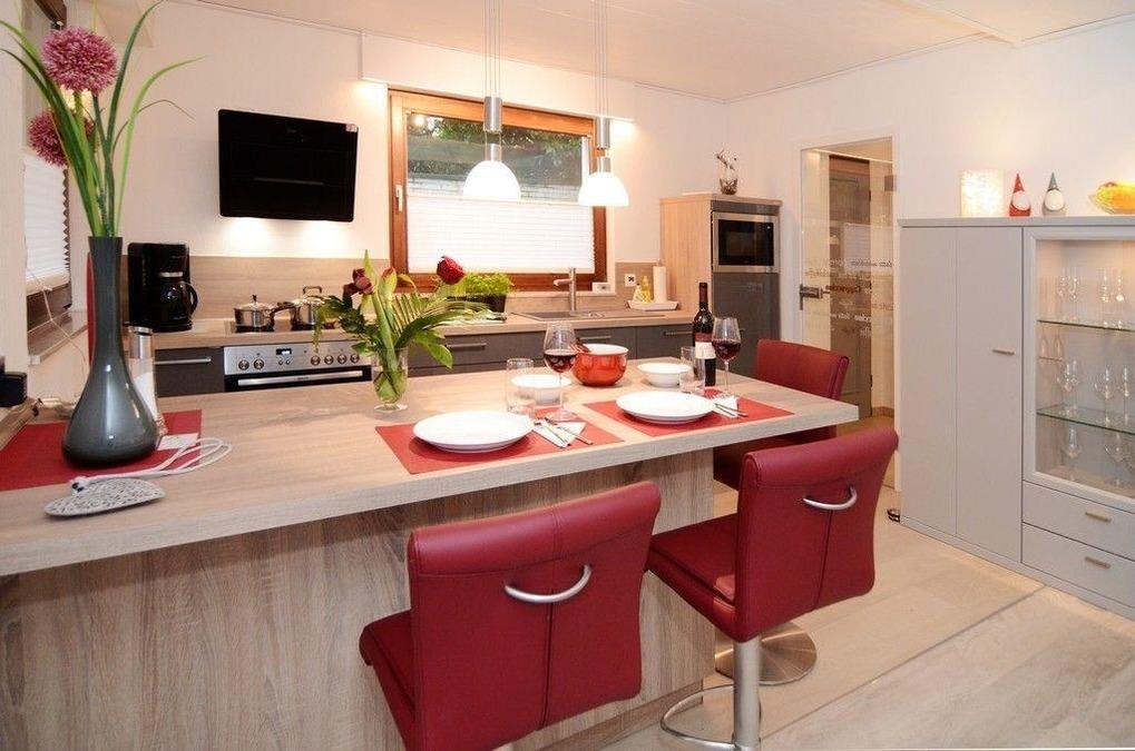 voll ausgestattete Küche mit Geschirr, Besteck, Gläsern, Vorlegbesteck, Töpfen, Pfannen, Schüsseln, Messern, Platten u.v.m. – alles für mindestens 6 Personen ausgelegt