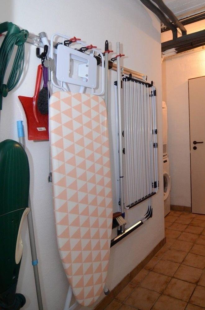 hier steht eine Waschhmaschine und Trockner zur Verfügung. Ein Regal für Vorratshaltung und zusätzlich ein kleiner Tiefkühlschrank sowie eine Dampf-Bügelstation..