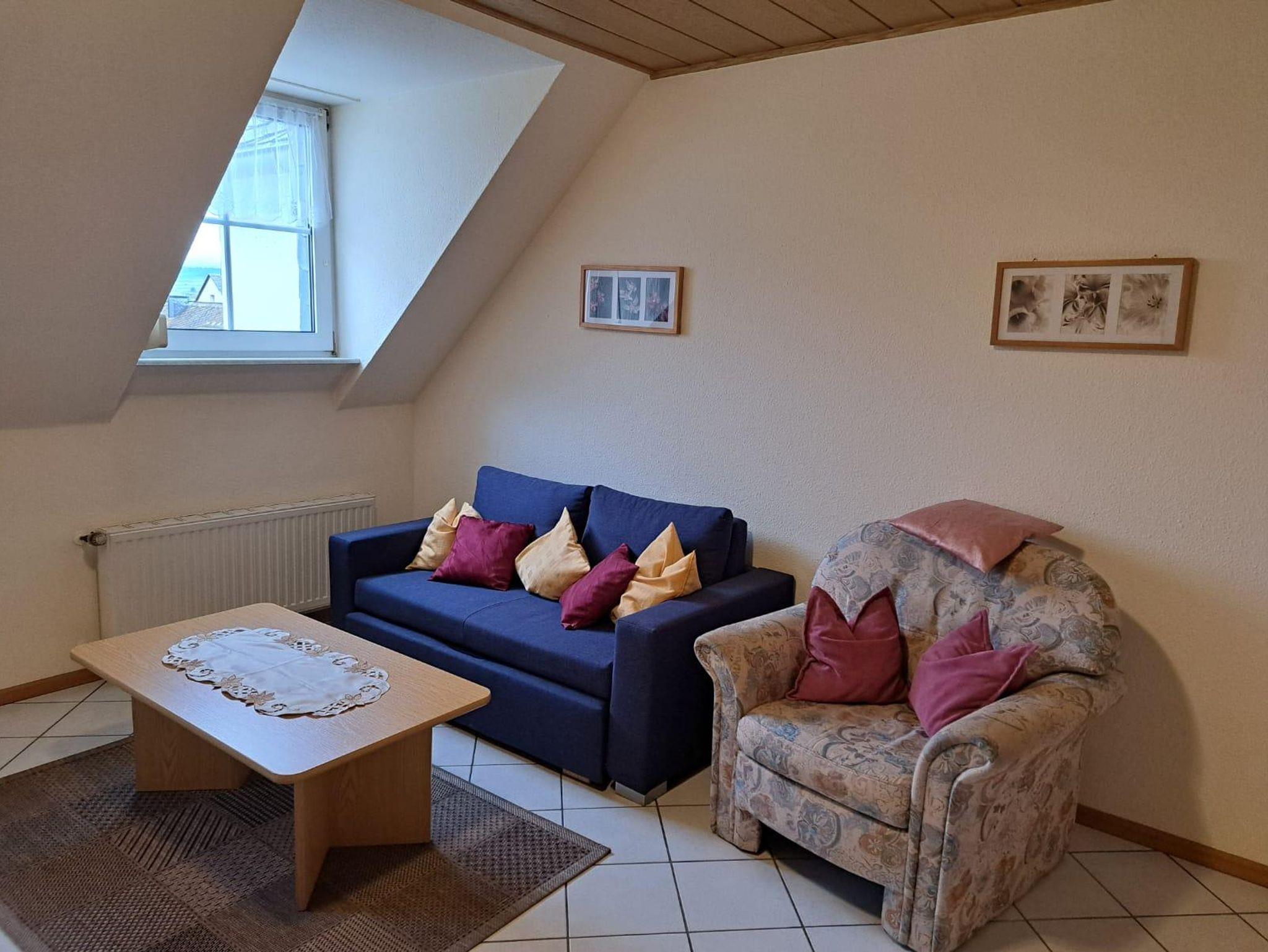 Komplett eingerichtete Ferienwohnung mit Doppelschlafzimmer, Wohnschlafraum, Küchenzeile, DU/WC und Balkon, Radio und SAT-TV.und WLAN für 2-4 Personen. Bettwäsche und Hand- und Badetücher sind vorhanden.