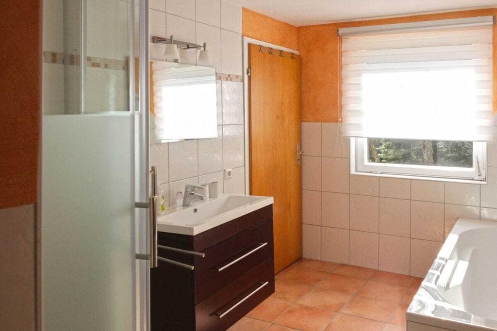 På 1. etage: (Stue(Fjernsyn)) , , , , Køkken(kakkelovn, kogeplade, ovn, opvaskemaskine , køleskab), soveværelse(, dobbeltseng, radio), soveværelse(, dobbeltseng, radio), soveværelse(, køjeseng), badeværelse(, toilet, badekar, bruser, håndvask), badeværelse(, toilet, bruser, håndvask), Internetadgang, Internetadgang, tørretumbler, vaskemaskine, balkon(havemøbler), varme, terrasse(havemøbler, solstole), parkering, tørreskab, Ladestation til el-biler, telefon