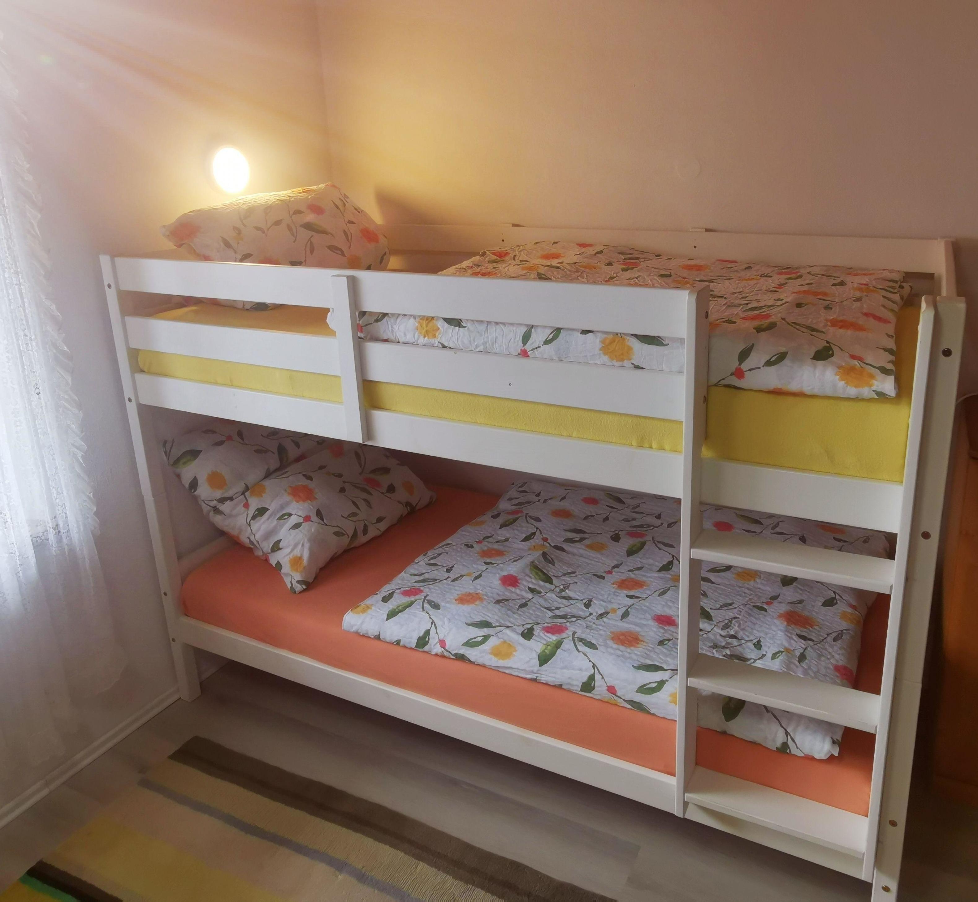 Unsere Ferienwohnung verfügt über einen Panoramablick auf die Berge, einen eigenen Eingang und bietet, neben einem Doppelbett für 2 Personen, ein Etagenbett mit zwei Einzelbetten, eine Küche, ein Badezimmer sowie einen sonnigen Balkon mit Balkonmöbeln & Sonnenschirm.