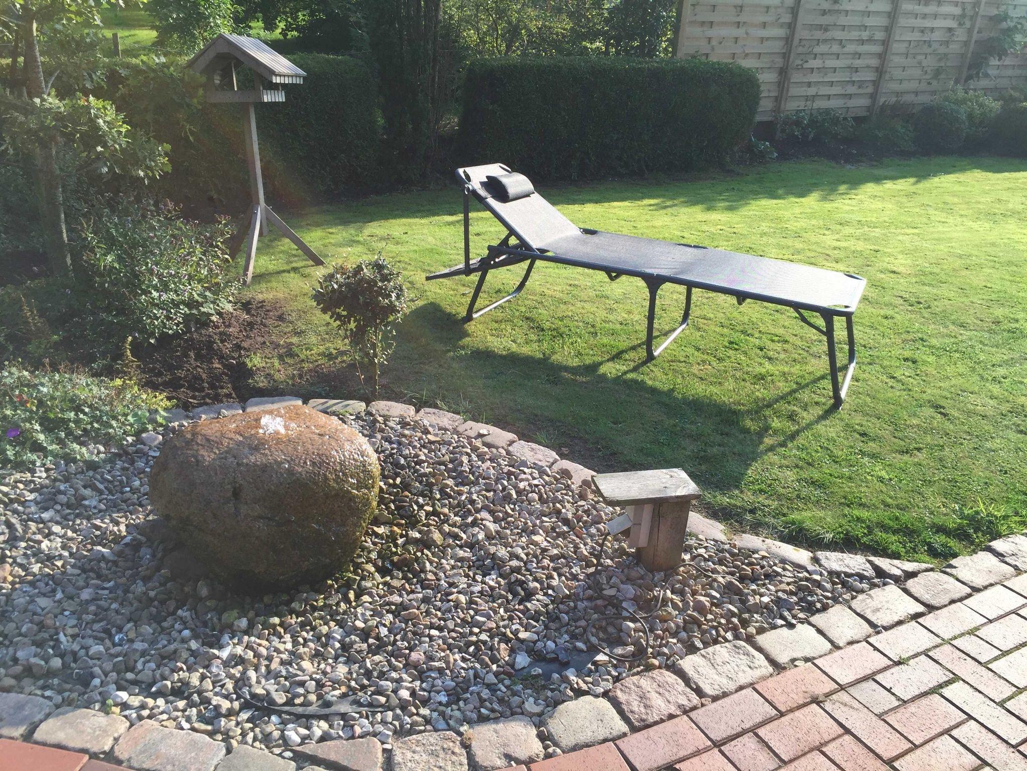 Die Sonnenuntergänge auf dem anliegenden Feld sind sehr schön. Das Haus hat einen großen Garten mit einer nach südwesten ausgerichteten Terasse, welche zum Entspannen und Relaxen einlädt. Entsprechende Gartenstühle/ Tisch und Relax Liege mit Polsterauflagen sind vorhanden. Ein großer gemauerter Grill und ein Springbrunnen sorgen für lange romantische und ungestörte Abende auf der Terrasse.
