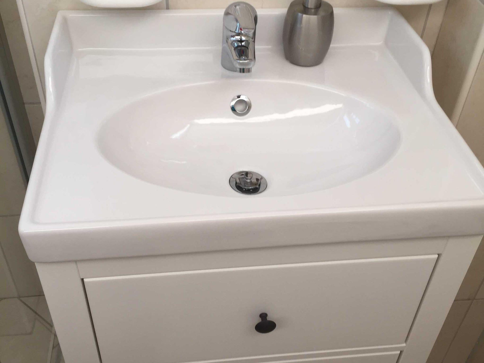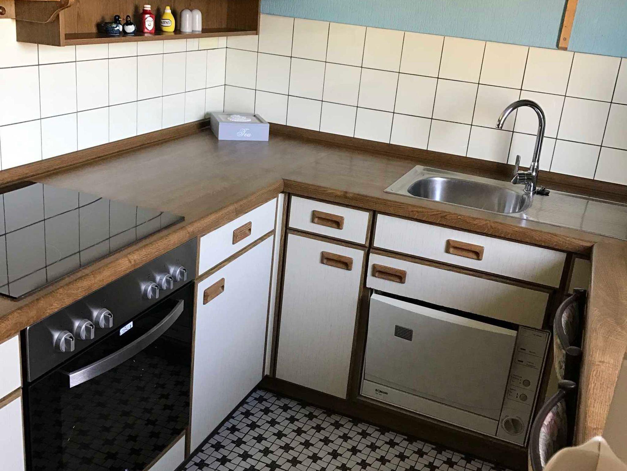 Das Badezimmer ist modern eingerichtet. Weiterhin gibt es eine separate Küche mit Backofen, Ceranfeld, sowie eine Kühl- und Gefrierkombi, Kaffemaschine, Wasserkocher, Toaster und einem Radio. In dem kleinen Abstellraum unter der Treppe kann man die Koffer und Reisetaschen, oder mitgebrachtes Spielzeug verstauen.