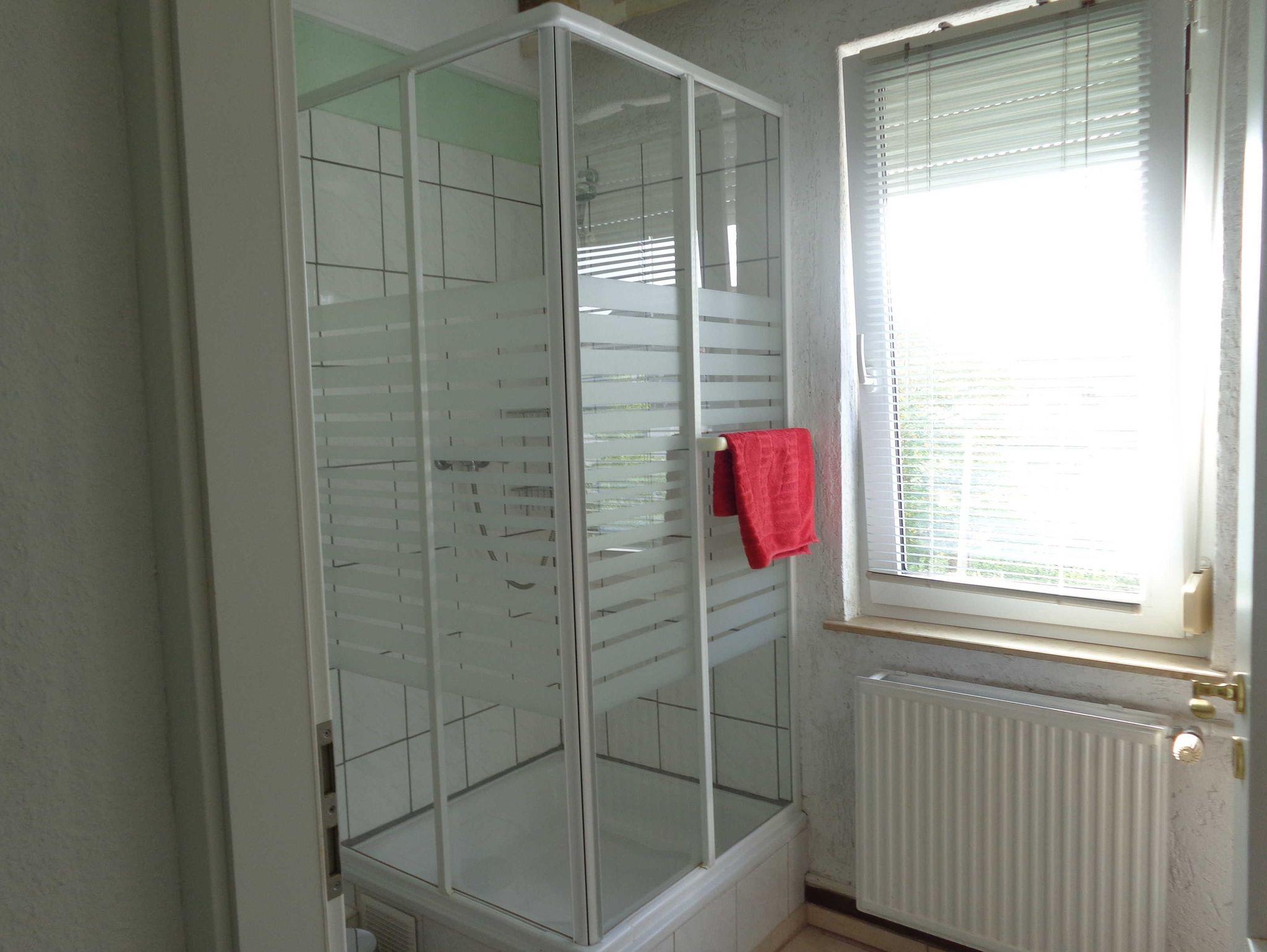 Das geräumige Doppelzimmer im Erdgeschoss des Hauses hat eine Größe von 26m² und verfügt über eine Sitzecke mit TV, zwei Einzelbetten sowie einen Kleiderschrank. Die Dusche ist im Zimmer integriert. Für jedes der beiden Doppelzimmer steht eine Toilette zur Verfügung, die über den Flur erreichbar ist.