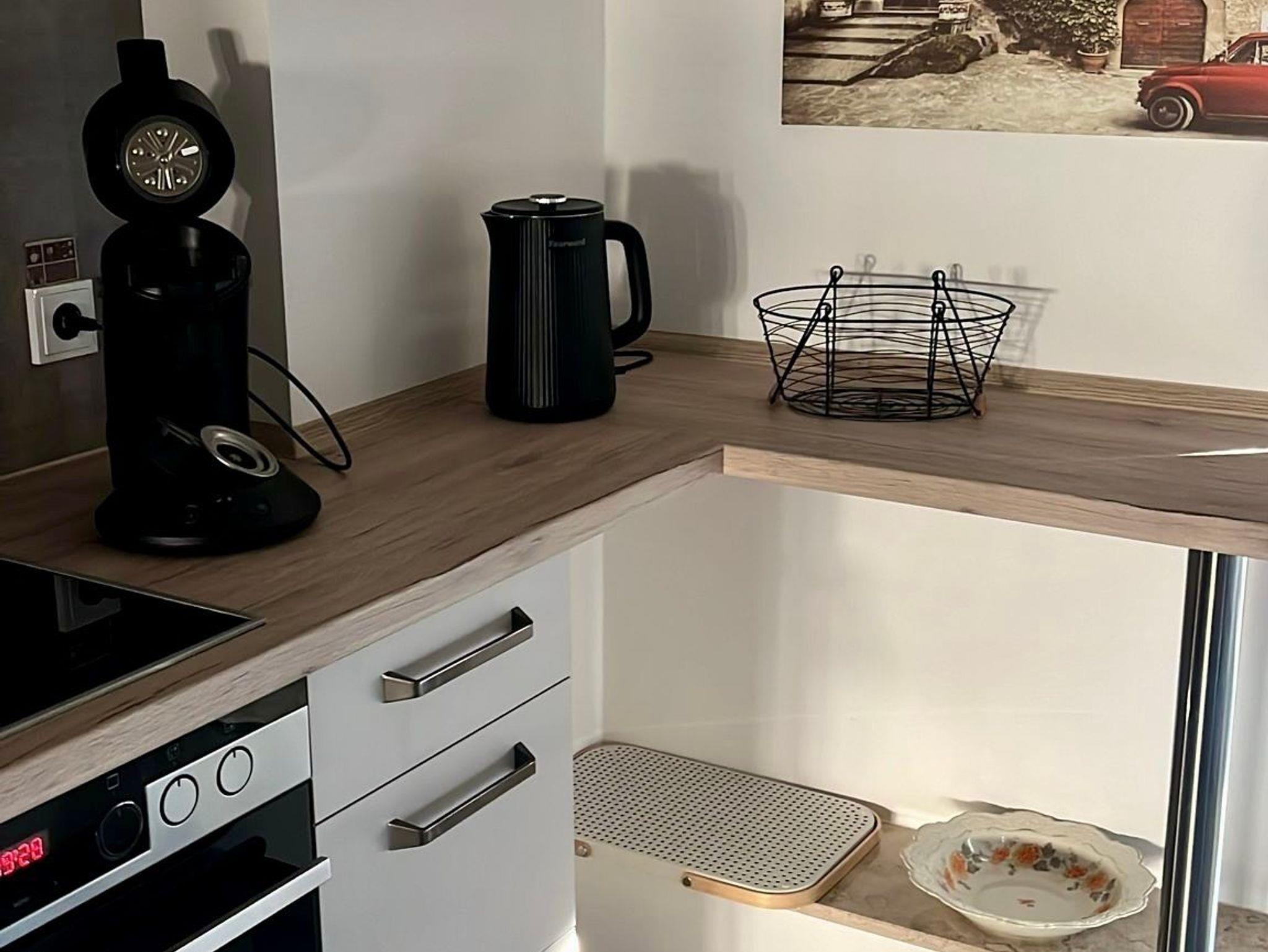 Die Küche ist voll ausgestattet (Kühlschrank, Tiefkühler, Spüle und Geschirrspülmaschine sowie Herd und Ofen) und verfügt über eine Grundausstattung zum Kochen sowie eine Senseo Maschine und einen Wasserkocher sowie Geschirr, Besteck, Gläser und Tassen. Darüberhinaus findet ihr Lappen, Geschirrtücher und Spülmittel vor.