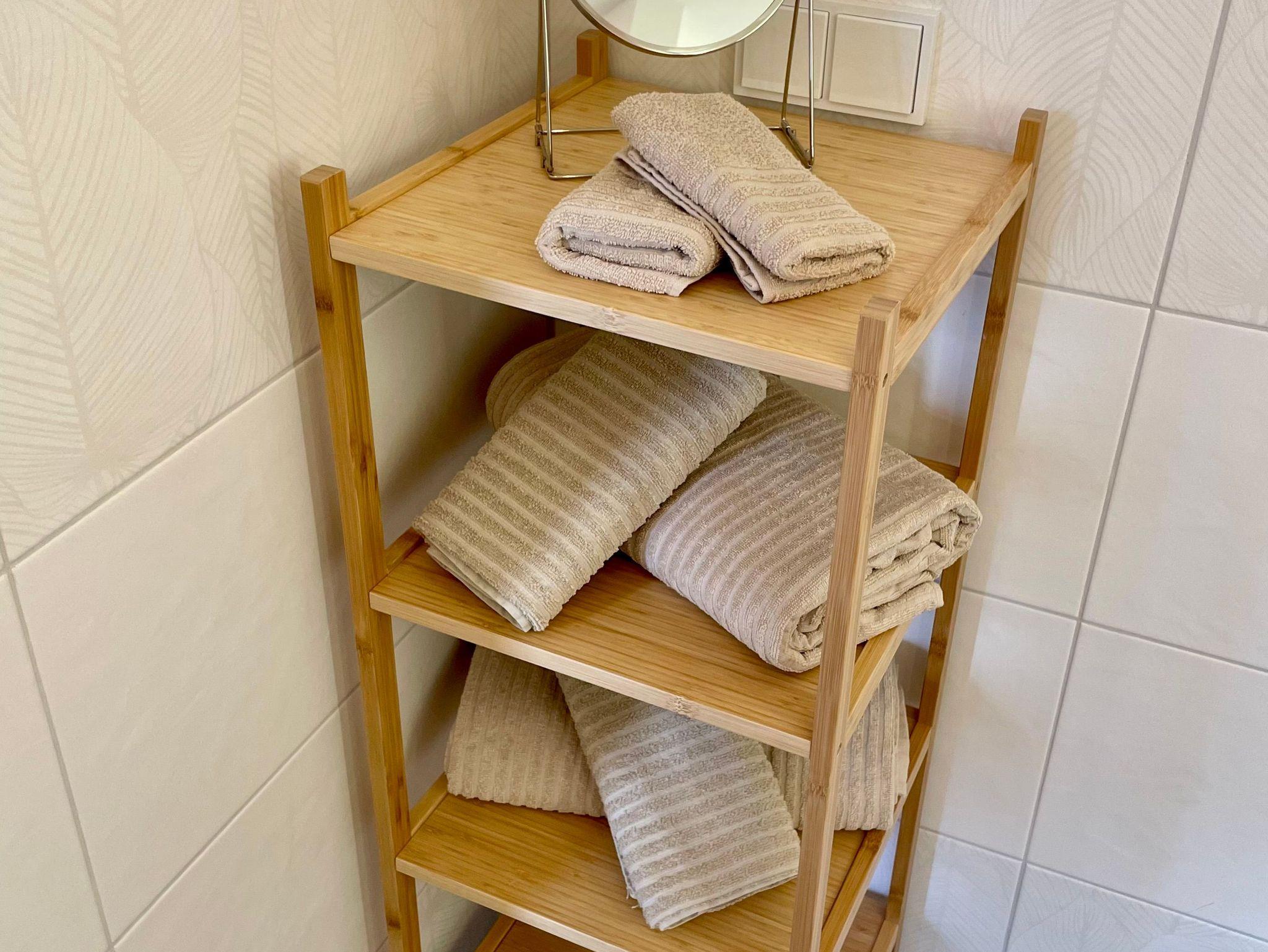 Das Badezimmer verfügt über eine schöne große Regendusche, WC und Waschbecken. Wir stellen Euch Duschbad, Shampoo, Conditioner und Handseife zur Verfügung. Des Weiteren findet ihr einen Föhn, sowie für jeden Gast eine Ausstattung an Handtüchern (Duschtuch, Handtuch und Gästetuch). Für die Mädels gibt es einen Schminkspiegel und jede Menge Stau- bzw. Ablageraum.