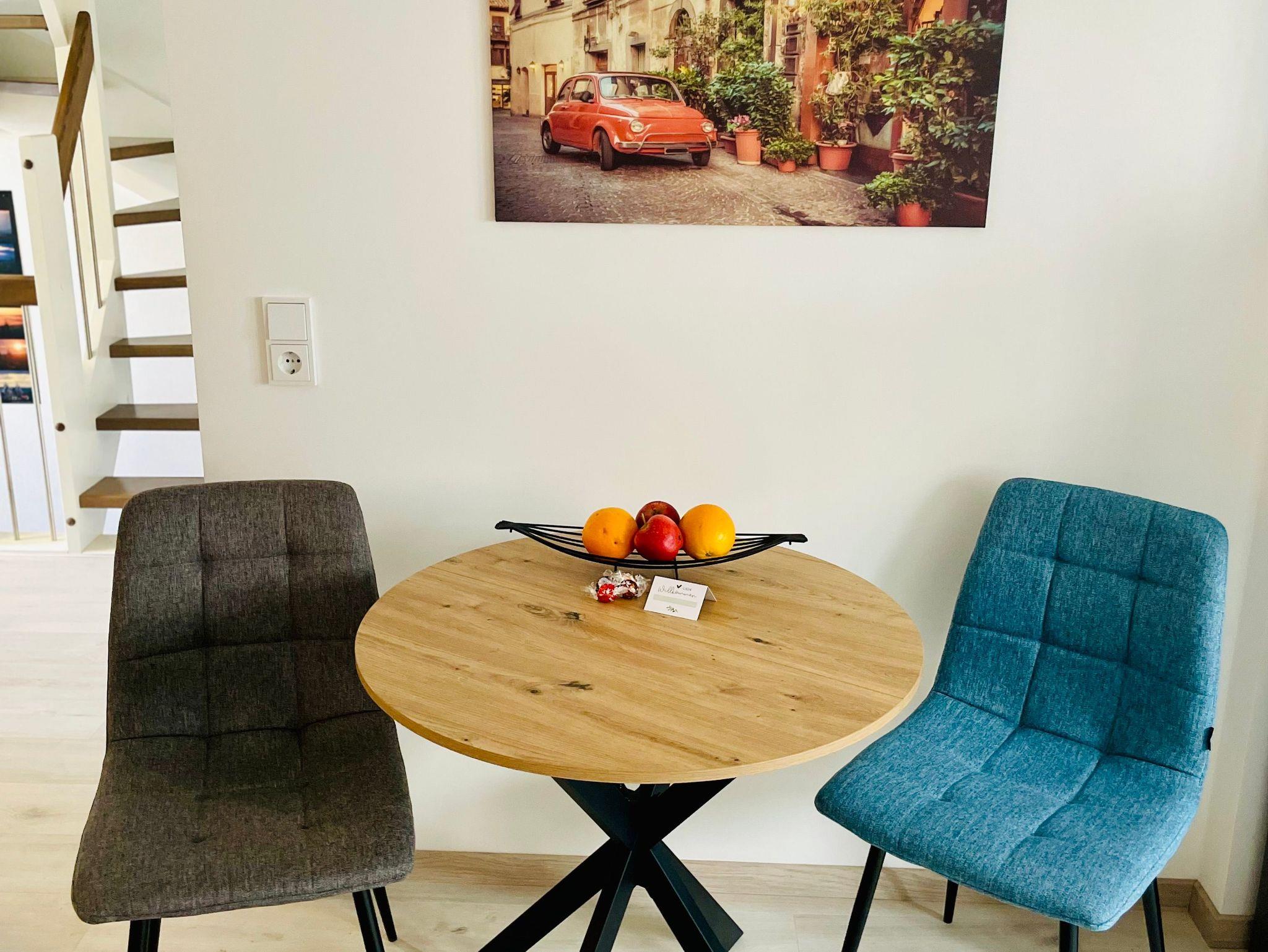 Das Wohnzimmer verfügt über ein Sofa, welches zeitgleich als Schlafsofa der dritten Person einen Schlafplatz bietet. Unser Fernsehen ist mit dem klassischen TV ausgestattet. Ihr könnt auch gerne mit Euren eigenen Zugängen alle gängigen Streaming Dienste nutzen. Ein paar Spiele und Bücher liegen für Euch bereit.