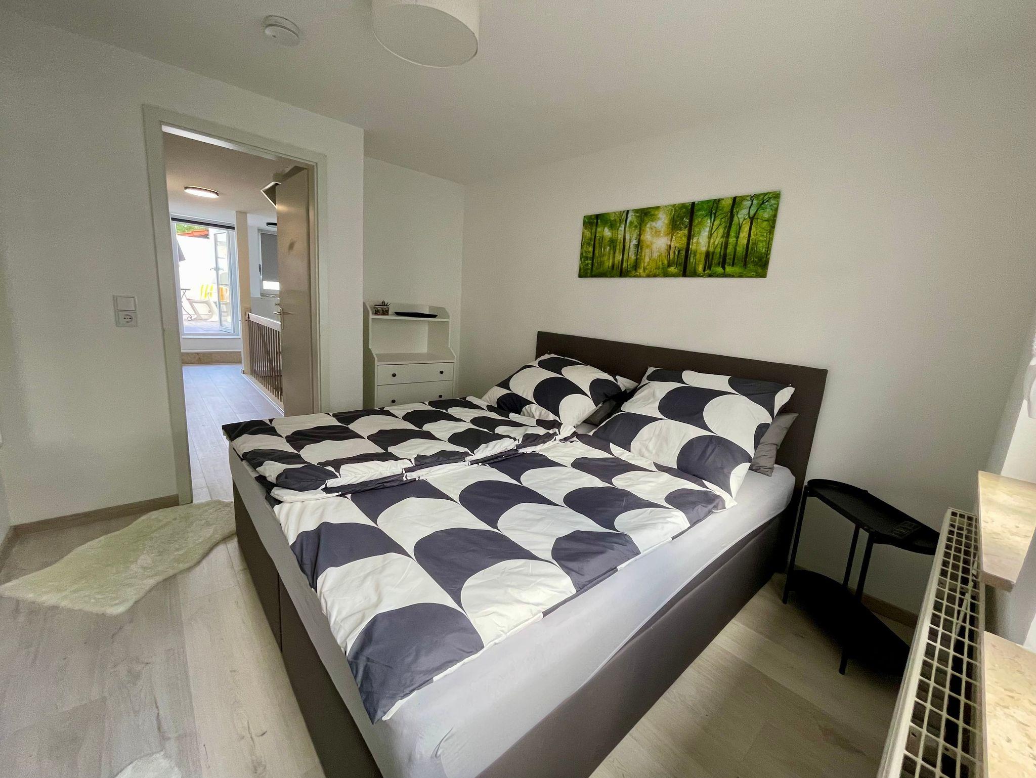 Im modernen Schlafzimmer könnt ihr wunderbar ausruhen. Es ist ausgestattet mit einer kleinen Kommode, einen großen Boxspringbett (1,80m x 2,00m) sowie einem kleinen Fernseher und einem Ganzkörperspiegel. Einen Kleiderschrank findet ihr direkt neben dem Schlafzimmer. Im Schrank liegt ein Handstreamer bereit, falls im Koffer doch einmal etwas knittrig geworden ist. Wir stellen Euch bei Eurem Aufenthalt pro Person eine Bettdecke, ein großes und ein kleines Kissen inkl. Bettzeug zur Verfügung.