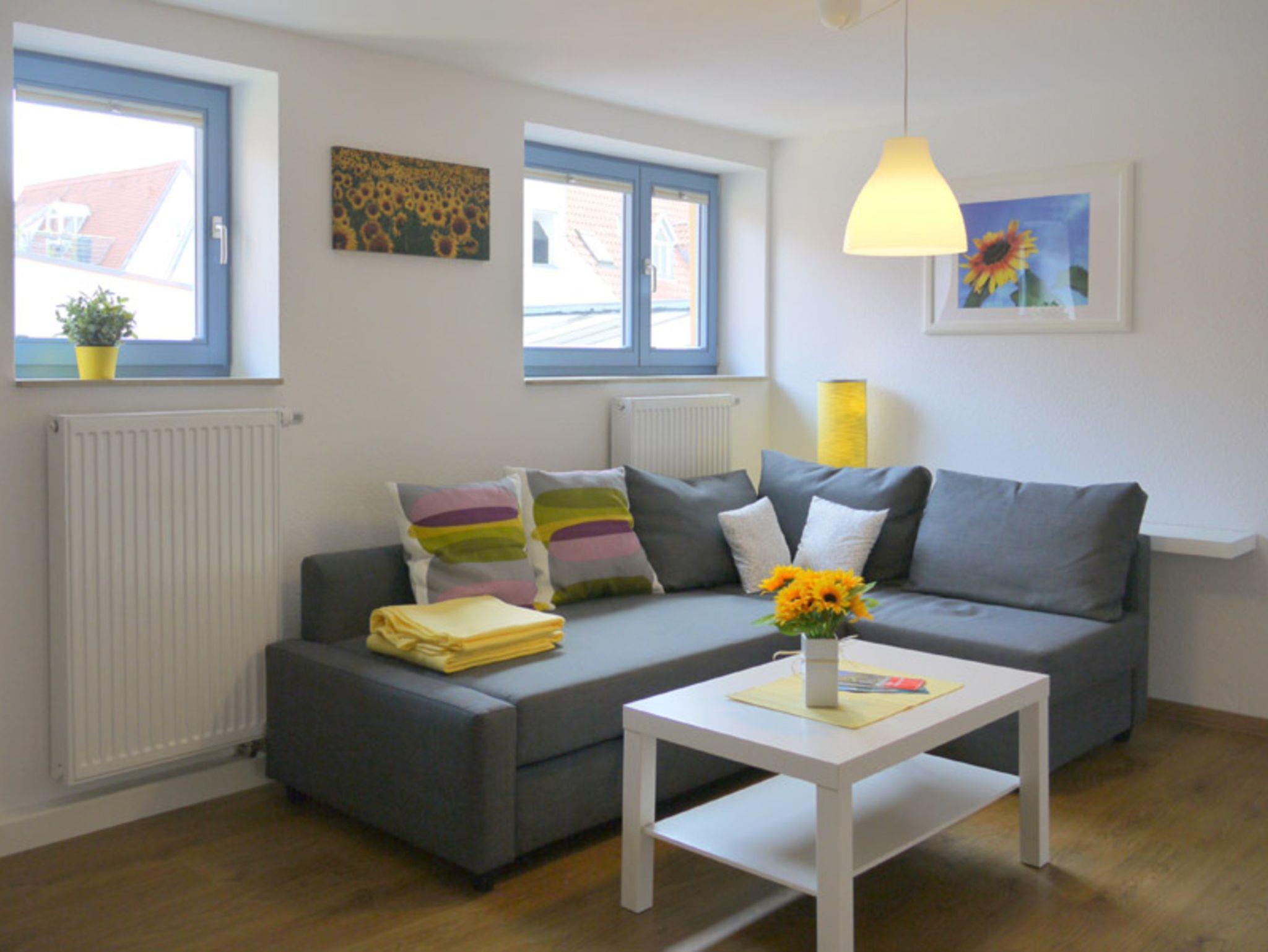 Die farbenfrohe, individuell und komfortable ausgestattete Ferienwohnung Sonnenblume liegt im 3. OG (Dachgeschoss) und verfügt auf 50 m² über 2 Schlafzimmer, ein Wohnzimmer mit zusätzlicher Schlafcouch und offener Küche sowie ein Bad mit Dusche/WC.