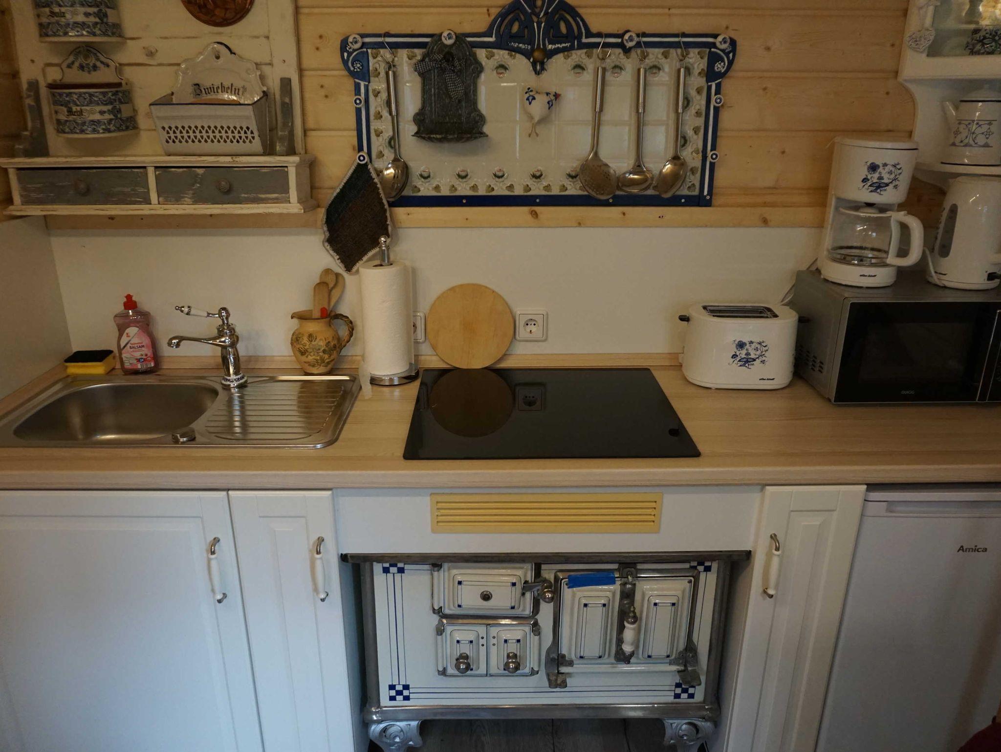 Küche mit E-Herd, Kühlschrank, Mikrowelle, Toaster u.a.