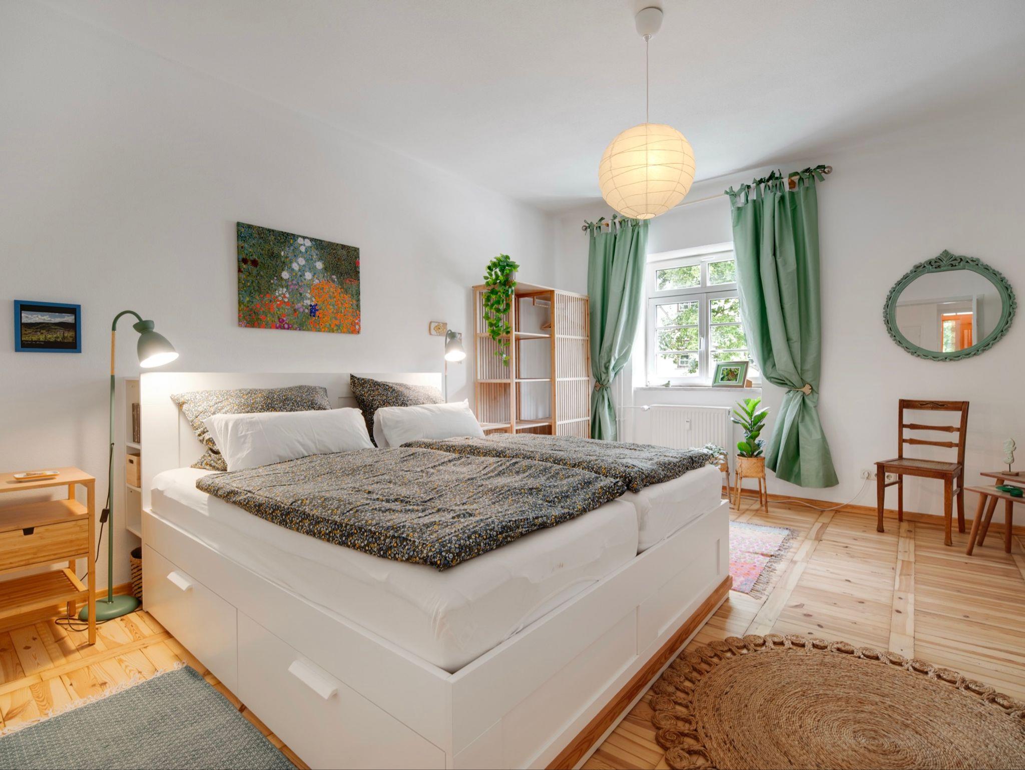 Die Wohnung wird ergänzt um ein grosses Schlafzimmer mit hohen Doppelbett sowie Kleiderschrank, Sitzplatz und Kofferbank.