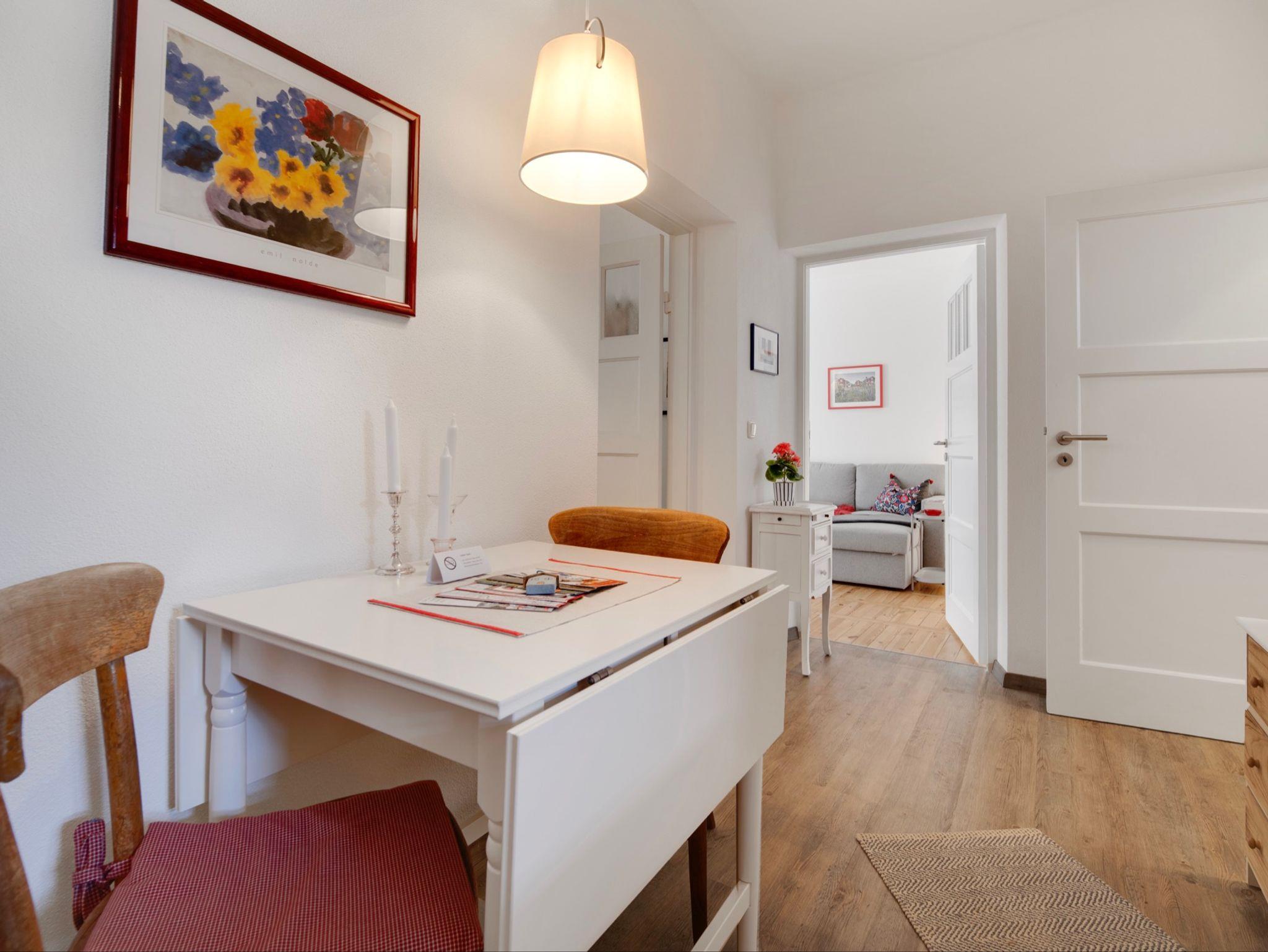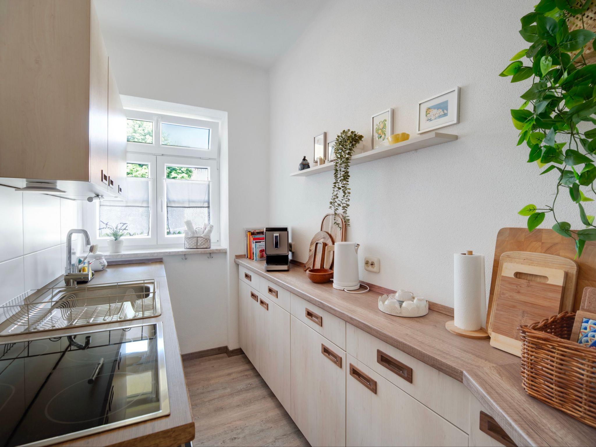 Diese helle, freundliche Ferienwohnung wurde im Frühjahr 2025 komplett neu hergerichtet. Über den Hauseingang betreten Sie den Flur mit Zugang zum Duschbad mit WC. Danach erreichen Sie die Wohnküche mit Sitzplatz für bis zu 4 Personen und einer Einbauküche mit Spüle, Kühlschrank, Herd und Backofen sowie Kaffeevollautomat. Aus der Wohnküche erreichen Sie das Wohnzimmer mit bequemen Schlafsofa (Liegefläche 140 mal 200 cm.) sowie Zugang zum Balkon mit Außen-Sitzplatz. Auf dem Balkon ist das Rauchen - bei geschlossener Tür zum Wohnzimmer - erlaubt. In der Wohnung selbst ist Rauchen untersagt - wir bitten - zur Vermeidung von Sonderreinigungskosten - um Einhaltung. Danke!