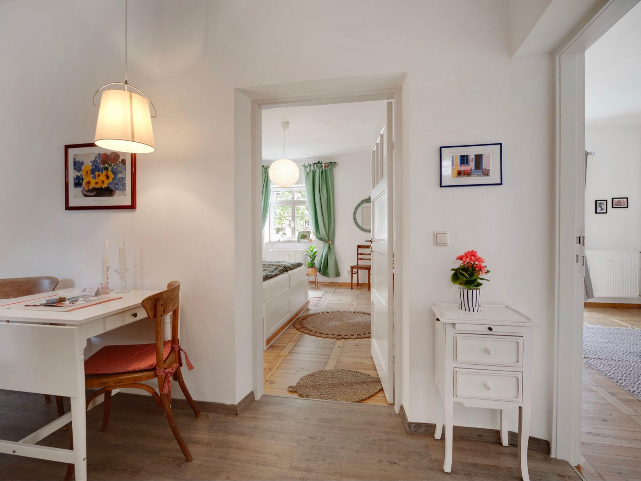 Diese gemütliche Ferienwohnung liegt in einem Mehrfamilienhaus im schönen Hanseviertel Erfurts. Über einen Laubengang erreichen Sie die im ersten Stockwerk gelegene Wohnung. Aufgrund der günstigen Lage erreichen Sie sowohl das Zentrum der Stadt Erfurt, Geschäfte des täglichen Bedarfs, die Fachhochschule und den Hauptbahnhof fußläufig in kurzer Zeit. Auch der Anger und die diversen Marktplätze (Wenigemarkt, Fischmarkt etc.) mit Restaurants und Geschäften sind sehr gut zu erreichen. Das Gebäude aus den 1930er Jahren versprüht historischen Charme und zeigt ansprechende Gestaltungselemente der Bauhausarchitektur. Von hier aus können Sie abwechslungsreiche Ausflüge in und um Erfurt unternehmen und Land und Leute in Thüringen kennenlernen.