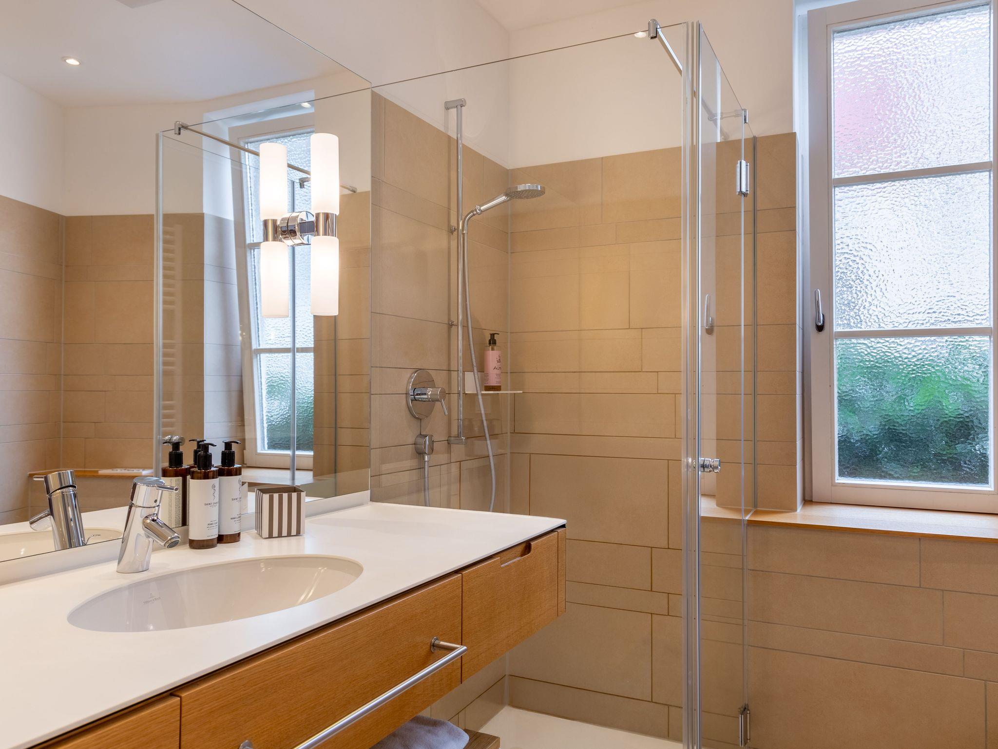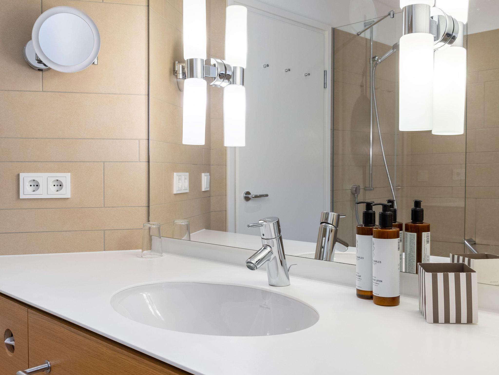 Badezimmer mit Dusche, Kosmetikspiegel, Bademantel, Haartrockner, Toilettenartikel und Hausschuhe