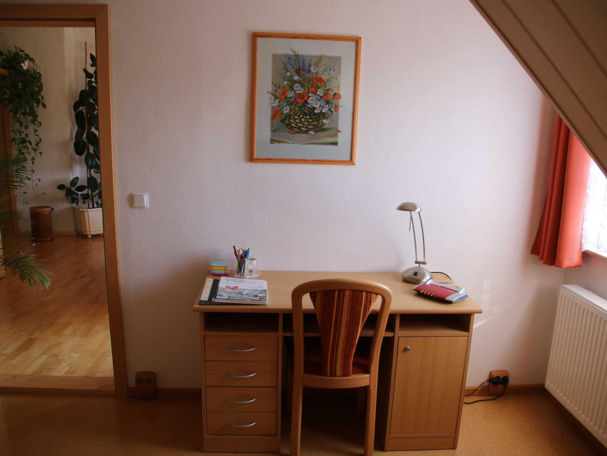 Lieber Gast, Sie erwartet eine gemütliche 74 m² große Ferienwohnung im 2. OG unseres Hauses. Die familienfreundliche, geschmackvolle Nichtraucherwohnung in ruhiger Lage verfügt über 2 Schlafräume, 1 Wohnzimmer, 1 Tageslichtbad mit Badewanne und Dusche sowie eine komplette Wohnküche. Eine Sitz- und Grillmöglichkeit im Garten laden zum Verweilen ein. Die Eis-, Leichtathletik- und Schwimmhalle, das Steigerwaldstadion, der Landtag, die IHK und die Thüringenhalle erreichen Sie gut zu Fuß. Mit Stadtbus/ Straßenbahn sind Sie schnell in der Altstadt und am Bahnhof (zu Fuß ca. 20 Min). WLAN auf Anfrage.