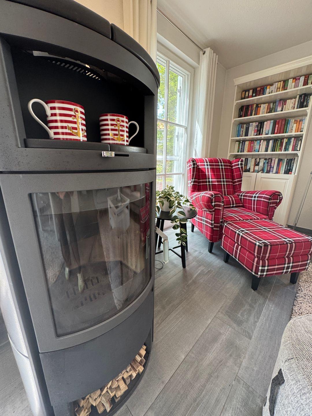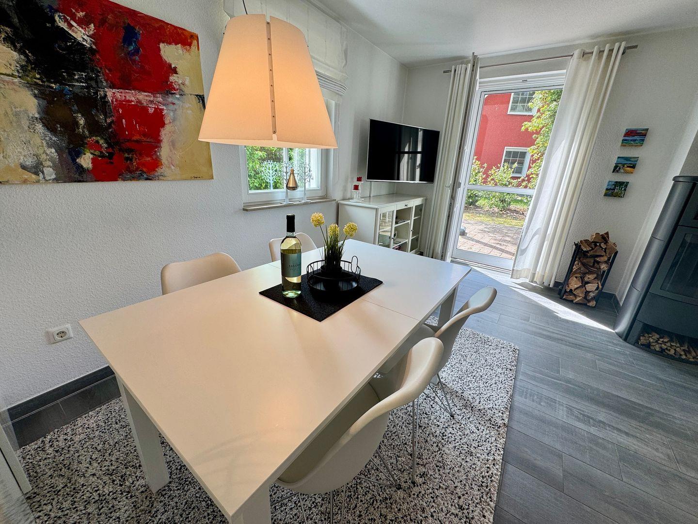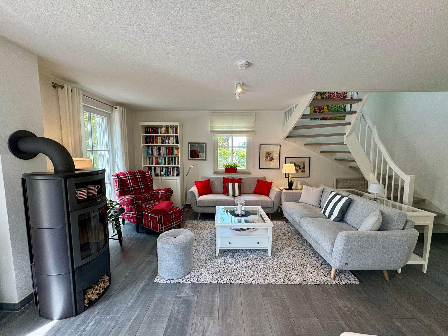 Der großzügige Wohnbereich bildet das Herzstück des Hauses. Eine gemütliche Sofaecke und der Kaminofen schaffen besonders an kühleren Tagen eine behagliche Atmosphäre – perfekt für entspannte Abende mit Familie oder Freunden. Die offene, komplett ausgestattete Küche mit angrenzendem Essbereich bietet alles, was Sie für gemeinsame Mahlzeiten und kulinarische Momente benötigen.