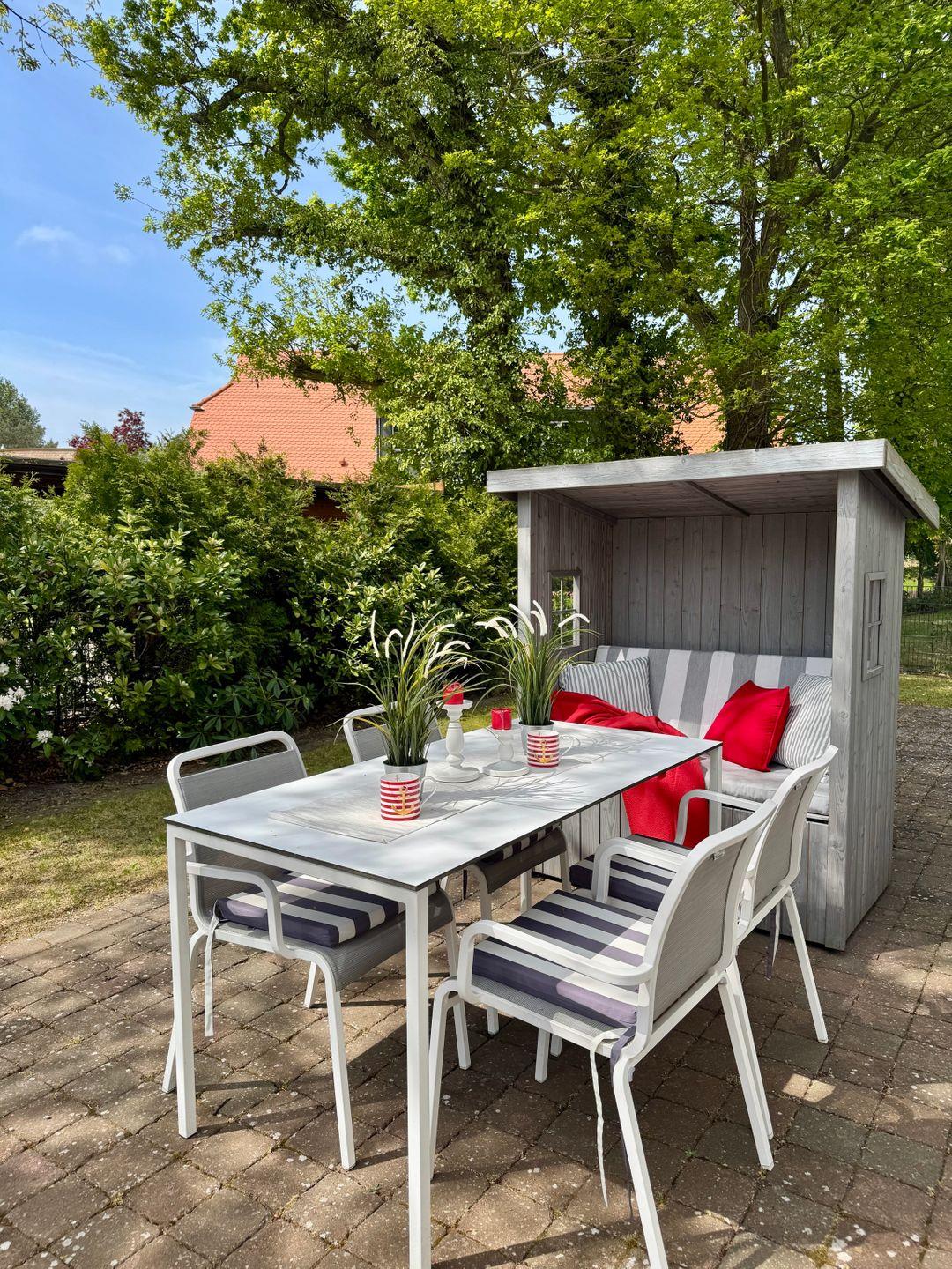Im Außenbereich lädt die große Terrasse zum Verweilen ein. Der liebevoll angelegte Garten mit Liegewiese bietet viel Platz zum Entspannen, während Kinder im Grünen spielen können. Bequeme Gartenmöbel sorgen für gemütliche Stunden unter freiem Himmel.