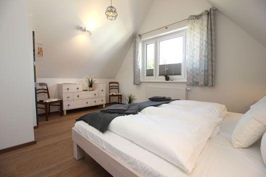 Im Obergeschoss erwarten Sie zwei separate Schlafzimmer mit komfortablen Doppelbetten, die für erholsame Nächte sorgen. Ein weiteres Badezimmer mit Dusche, WC und Waschtrockner bietet zusätzlichen Komfort während Ihres Aufenthalts.