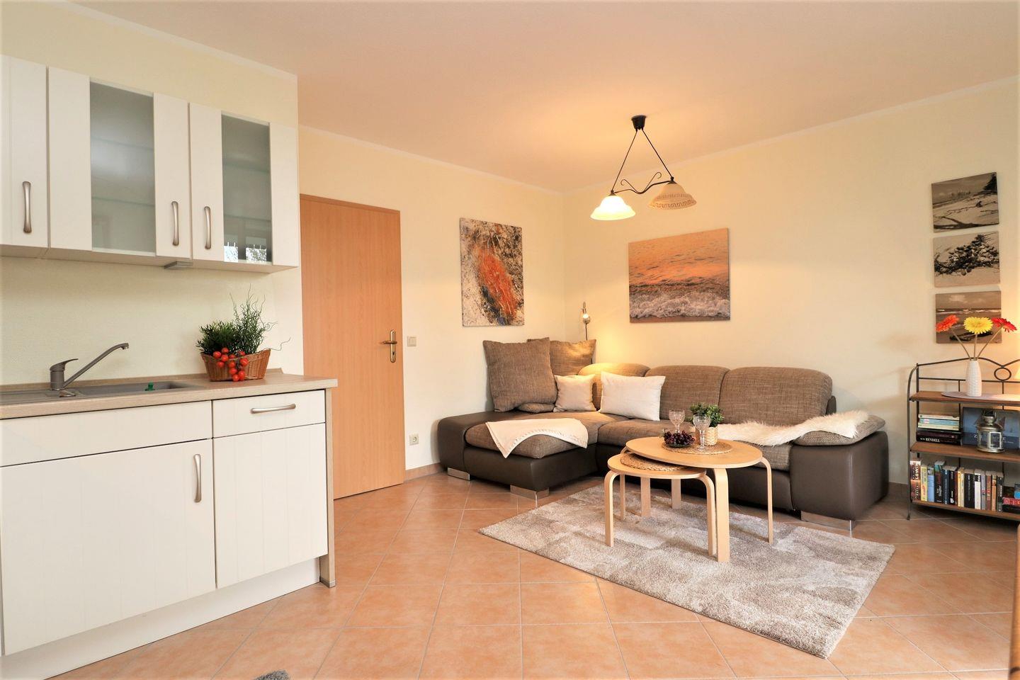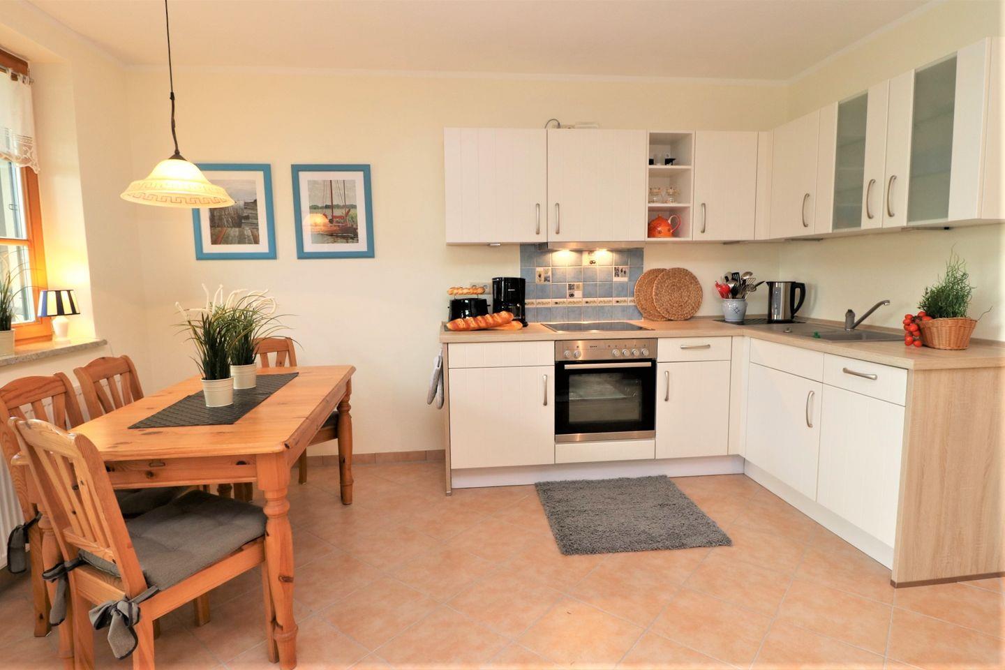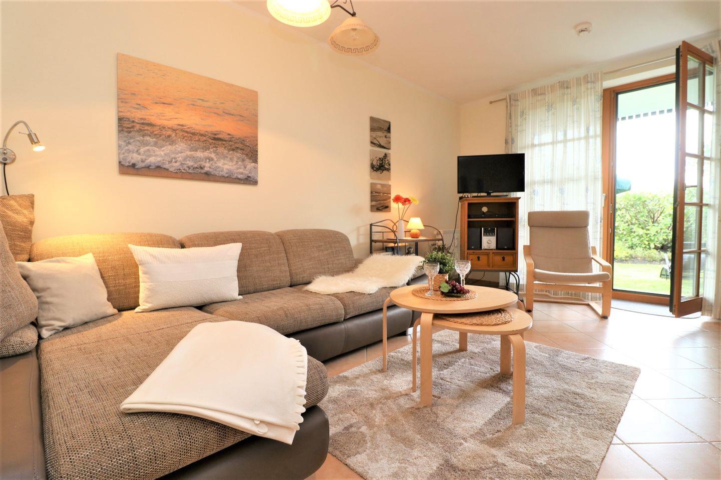 Dieses charmante Appartement im Erdgeschoss bietet auf 43 m² ausreichend Platz für bis zu 3 Personen und ist der perfekte Rückzugsort für entspannte Urlaubstage. Die Süd-West-Terrasse gewährt Ihnen einen Blick auf den Bodden, umgeben von viel Grün – eine wahre Oase der Ruhe. Mit etwas Glück können Sie hier sogar das eine oder andere Reh am Ufer des Boddens beobachten. Das Wohnzimmer ist mit viel Liebe zum Detail eingerichtet und verfügt über eine bequeme Schlafcouch, die bei Bedarf zusätzlichen Schlafplatz bietet. Die integrierte Küchenzeile ermöglicht es Ihnen, gemeinsam Mahlzeiten zuzubereiten und sich wie zu Hause zu fühlen. Im Schlafzimmer erwartet Sie ein gemütliches Doppelbett, das für einen erholsamen Schlaf sorgt. Das Bad ist mit einer modernen Dusche und einem WC ausgestattet. Zusätzlich gibt es eine Waschmaschine, die für längere Aufenthalte oder für frische Wäsche zwischendurch nützlich ist. Ein Pkw-Stellplatz befindet sich direkt auf dem Grundstück der Ferienanlage, sodass Sie Ihr Auto bequem abstellen können. Haustiere sind nicht gestattet, und das Rauchen ist im Appartement nicht erlaubt. W-LAN steht Ihnen während Ihres Aufenthalts kostenlos zur Verfügung, damit Sie in Verbindung bleiben können.