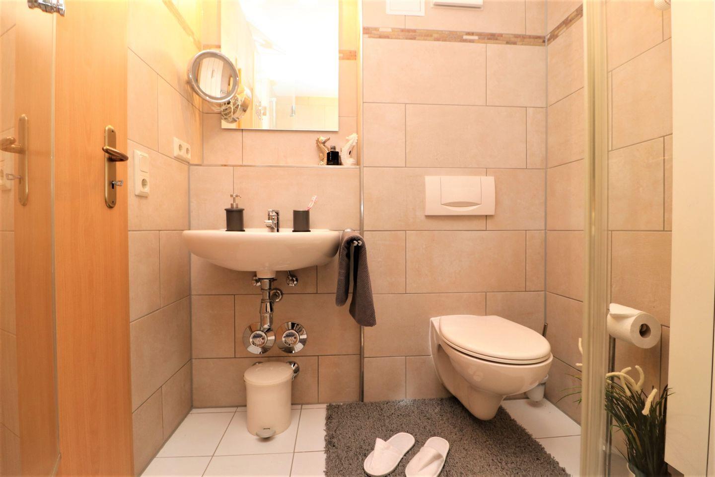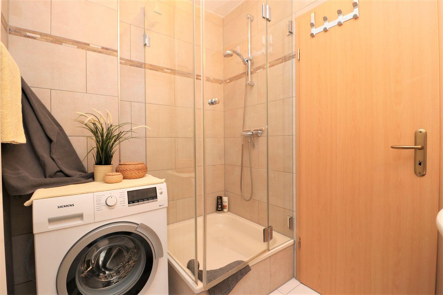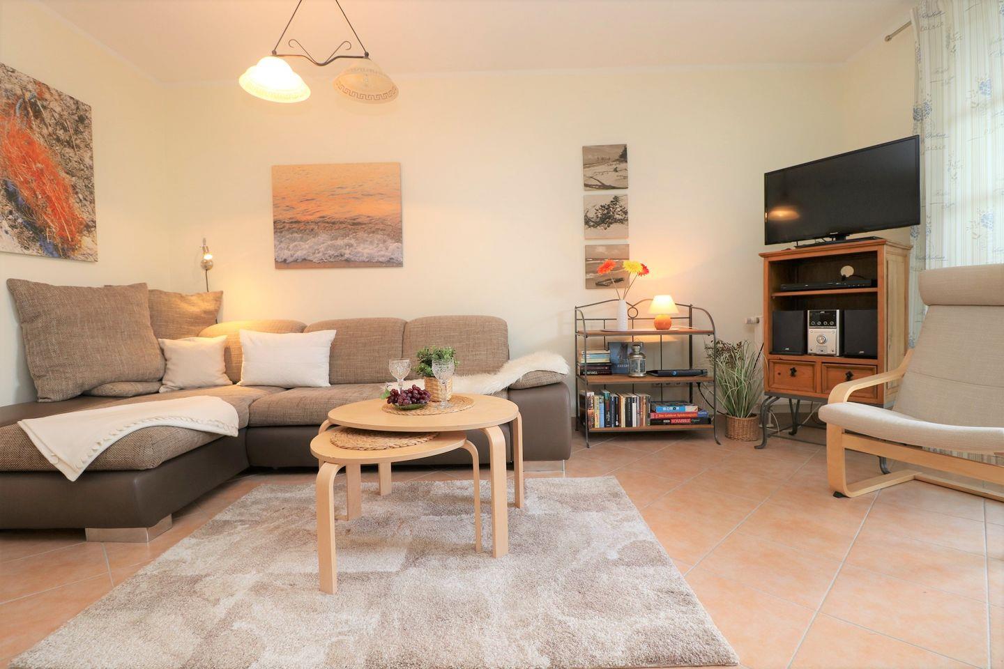 Dieses charmante Appartement im Erdgeschoss bietet auf 43 m² ausreichend Platz für bis zu 3 Personen und ist der perfekte Rückzugsort für entspannte Urlaubstage. Die Süd-West-Terrasse gewährt Ihnen einen Blick auf den Bodden, umgeben von viel Grün – eine wahre Oase der Ruhe. Mit etwas Glück können Sie hier sogar das eine oder andere Reh am Ufer des Boddens beobachten. Das Wohnzimmer ist mit viel Liebe zum Detail eingerichtet und verfügt über eine bequeme Schlafcouch, die bei Bedarf zusätzlichen Schlafplatz bietet. Die integrierte Küchenzeile ermöglicht es Ihnen, gemeinsam Mahlzeiten zuzubereiten und sich wie zu Hause zu fühlen. Im Schlafzimmer erwartet Sie ein gemütliches Doppelbett, das für einen erholsamen Schlaf sorgt. Das Bad ist mit einer modernen Dusche und einem WC ausgestattet. Zusätzlich gibt es eine Waschmaschine, die für längere Aufenthalte oder für frische Wäsche zwischendurch nützlich ist. Ein Pkw-Stellplatz befindet sich direkt auf dem Grundstück der Ferienanlage, sodass Sie Ihr Auto bequem abstellen können. Haustiere sind nicht gestattet, und das Rauchen ist im Appartement nicht erlaubt. W-LAN steht Ihnen während Ihres Aufenthalts kostenlos zur Verfügung, damit Sie in Verbindung bleiben können.