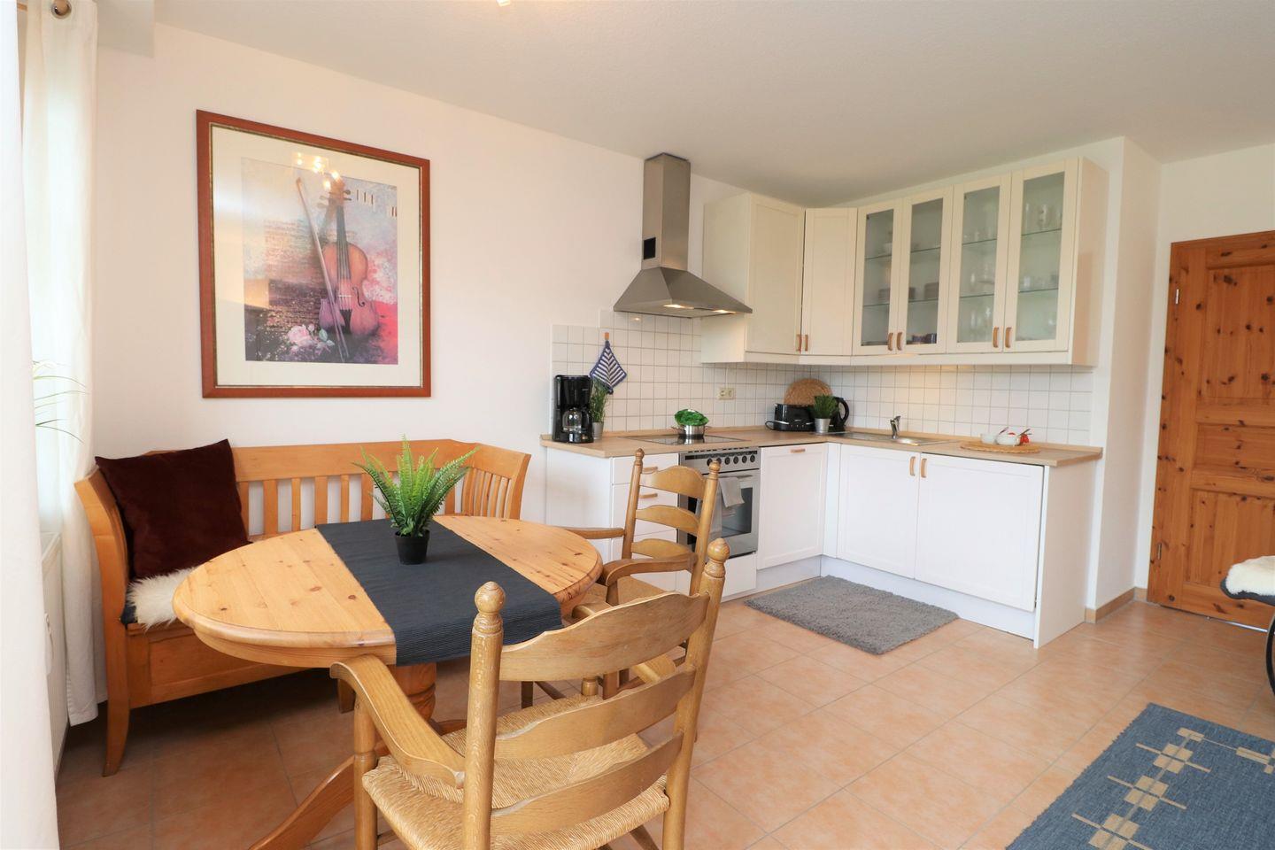 Dieses liebevoll eingerichtete Appartement bietet auf 42 m² Platz für maximal 3 Personen und ist der perfekte Ort zum Erholen und Entspannen. Der Wohnbereich lädt mit bequemen Möbeln zum Verweilen ein und bietet eine gemütliche Atmosphäre. Die integrierte Küchenzeile ermöglicht es Ihnen, während des Kochens im Gespräch mit Ihren Lieben zu bleiben.