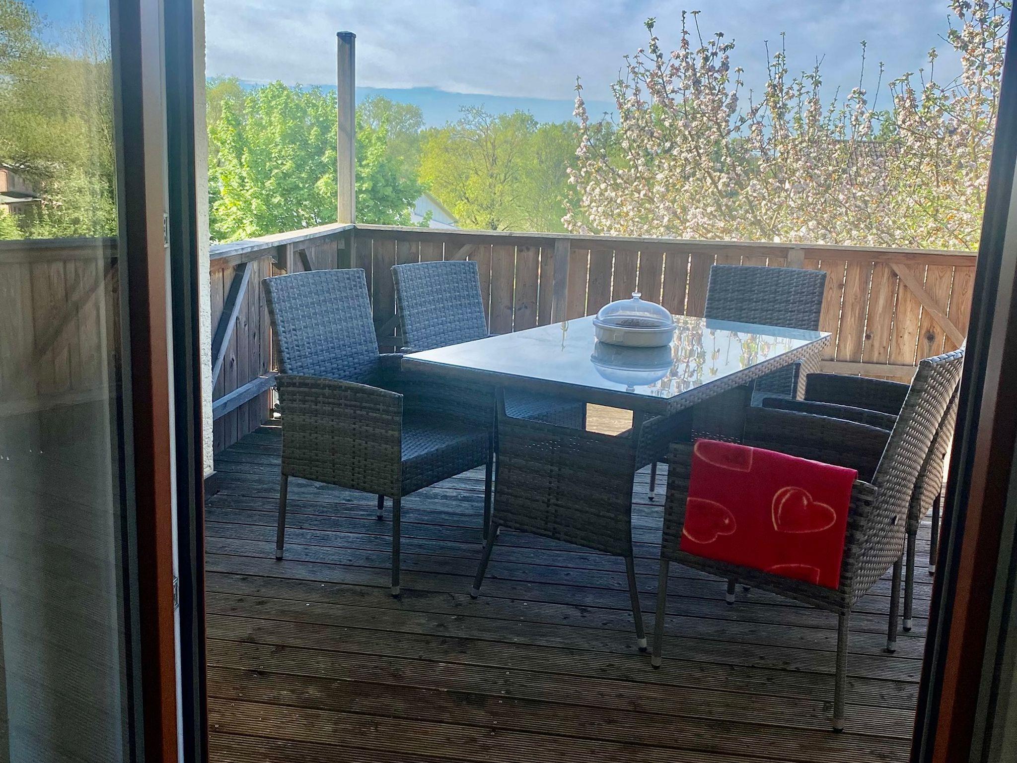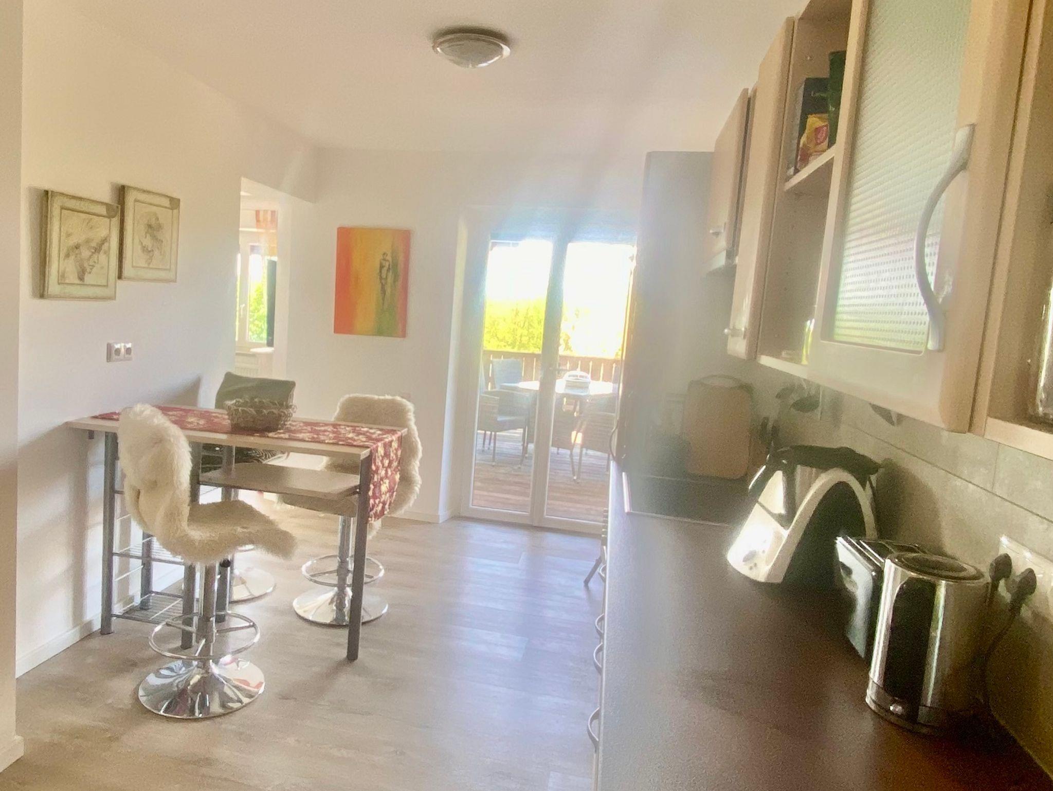 Die freundliche Küche lädt ein zum gemeinsamen Kochen und gemütlichen beisammen sein. Im Sommer, draußen auf der großen Dachterrasse auf einer 6er Sitzgelegenheit mit großem Tisch. Der Ausblick bezaubert auf die Aulandschaft oder den hauseigenen Garten.