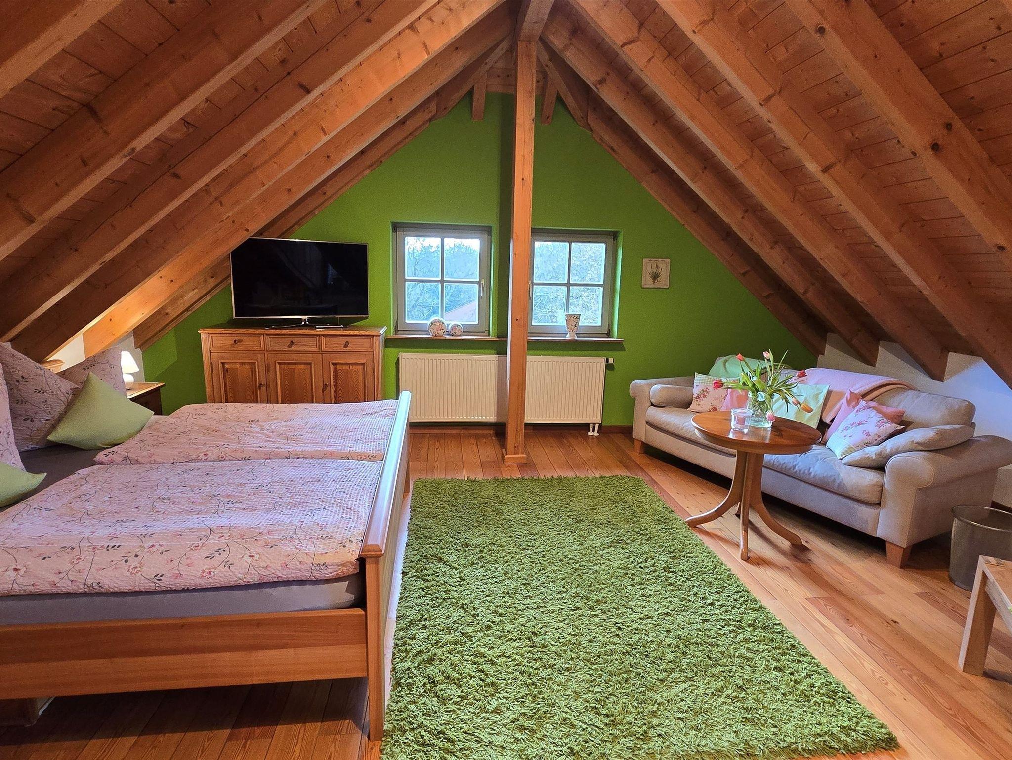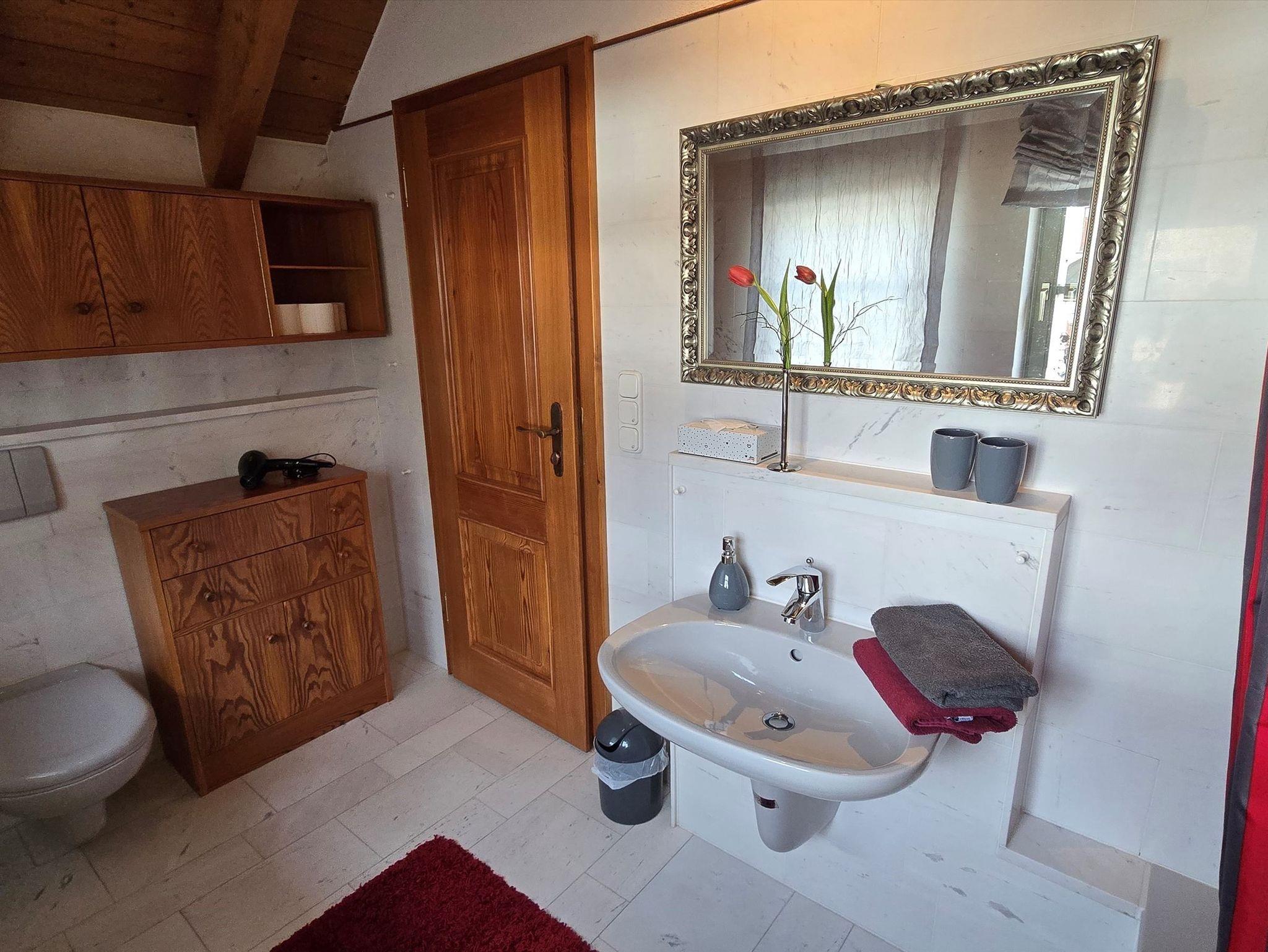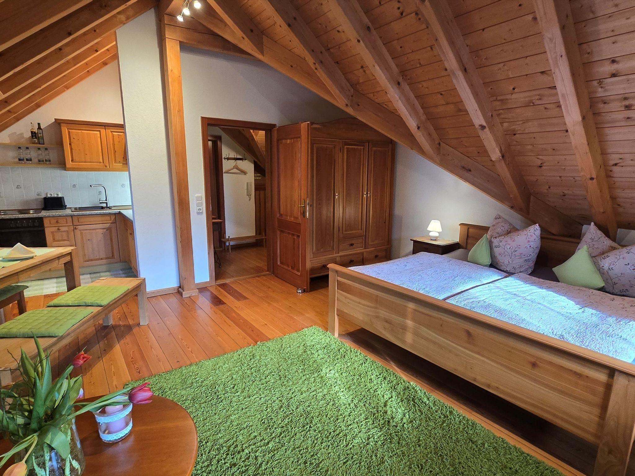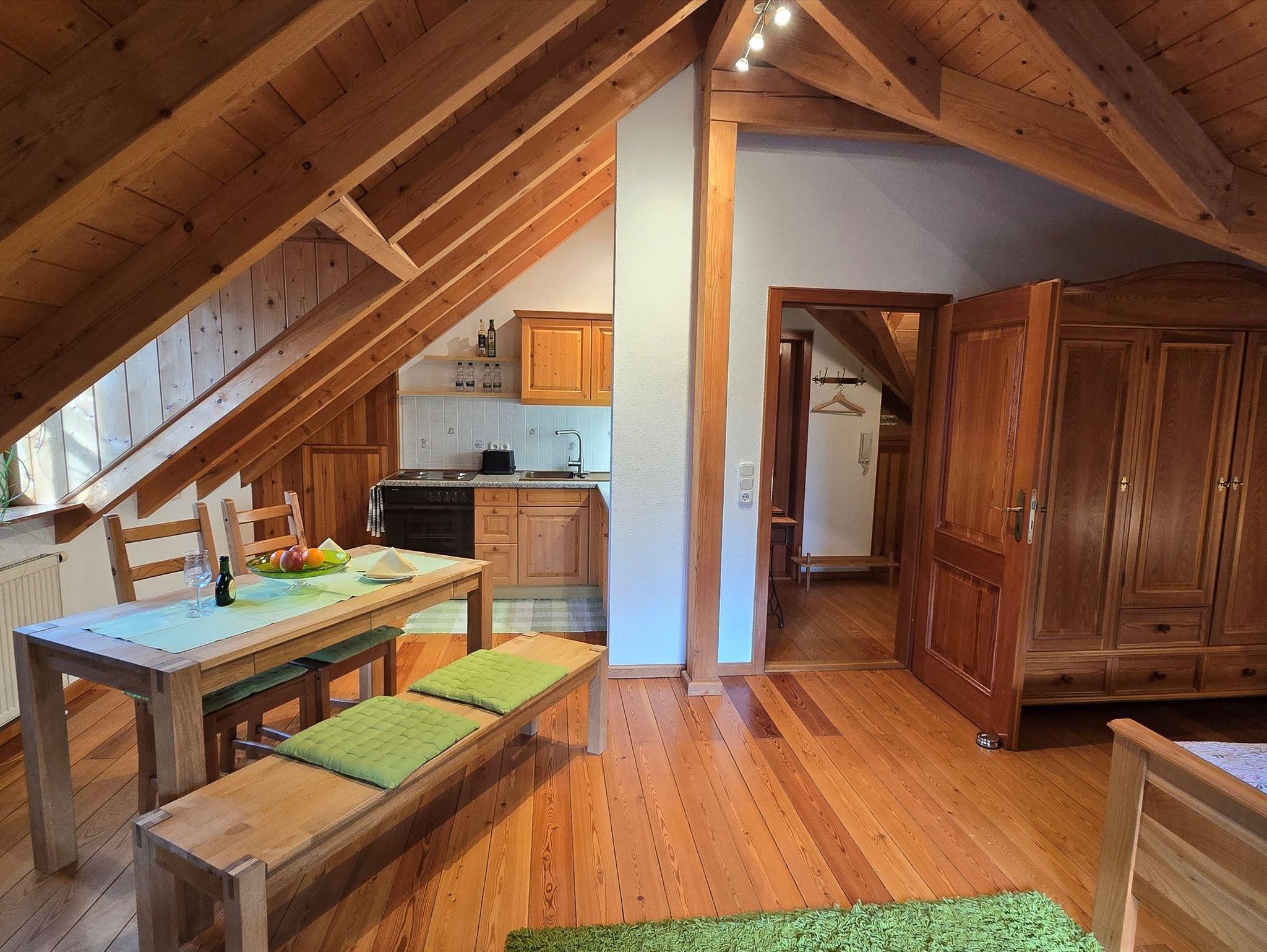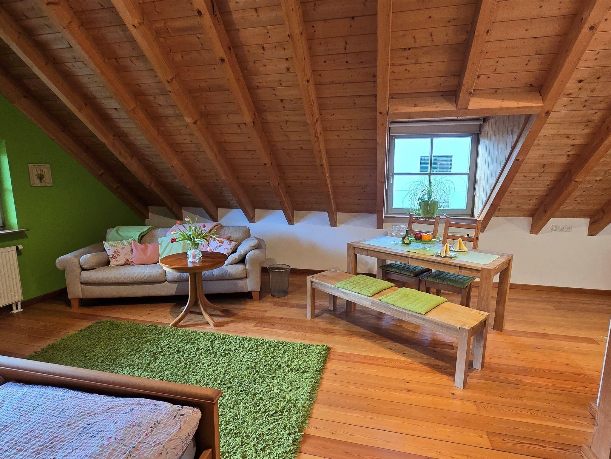 Unsere gemütlich eingerichtete Ferienwohnung bietet Platz für max. drei Erwachsene oder eine Familie mit zwei Kindern. Ein Zustellbett für die dritte Person und / oder Babybett für Kleinkinder stehen auf Anfrage zur Verfügung. Das gemütliche Wohn- und Schlafzimmer mit Couch und SmartTV lädt zum Verweilen ein. Die komplett ausgestattete Küche mit Kühlschrank inkl. Gefrierfach, Herd, Backofen, Wasserkocher, Toaster und Kaffeepadmaschine lässt keine Wünsche offen. Die Ferienwohnung verfügt über ein Schlaf-Wohnzimmer mit Kochnische sowie Esstisch mit Sitzgelegenheit für vier Personen. Im geräumigen Badezimmer mit Tageslicht stehen Ihnen Handtücher, Fön und Hygienartikel zur Verfügung. Zum Reinigen Ihrer Kleidung bieten wir Ihnen gerne einen Wäscheservice an. Die Preise hierfür finden Sie in unserer ausführlichen Gästemappe vor Ort. Ebenso stellen wir Ihnen täglich kostenfrei Mineralwasser zur Verfügung und holen Ihnen auf Wunsch morgens zum Einkaufspreis frische Brötchen und / oder die aktuelle Tageszeitung.