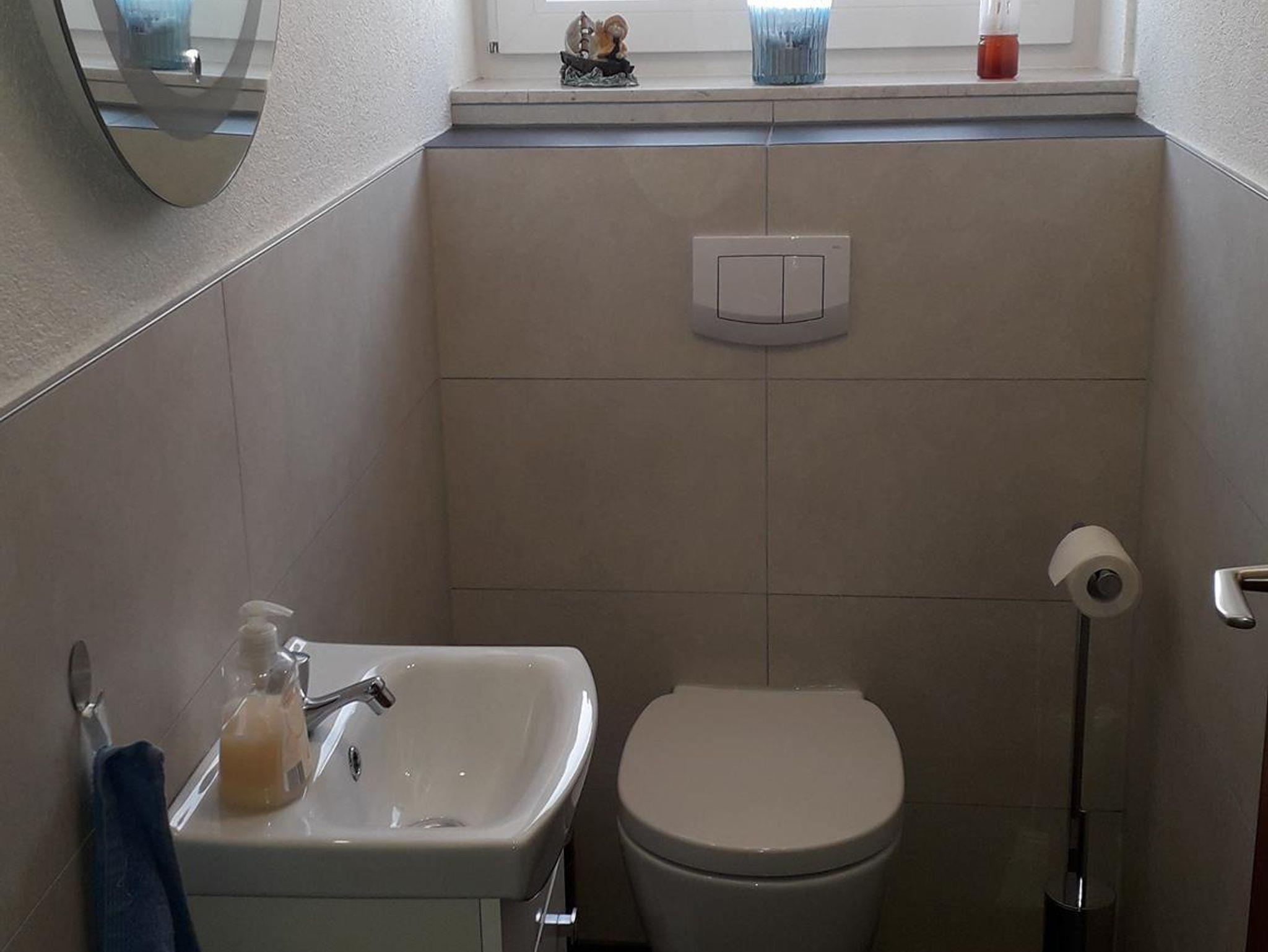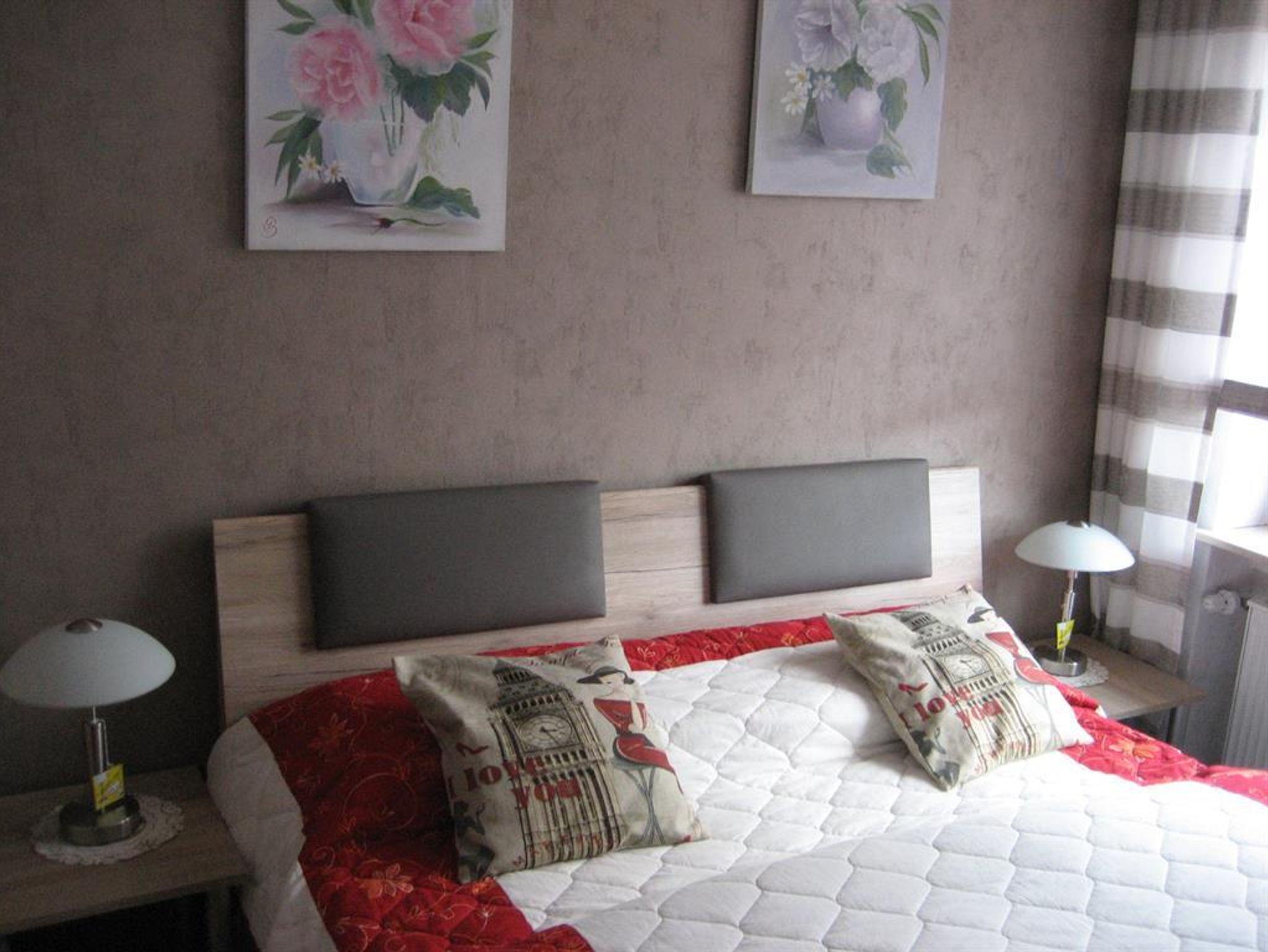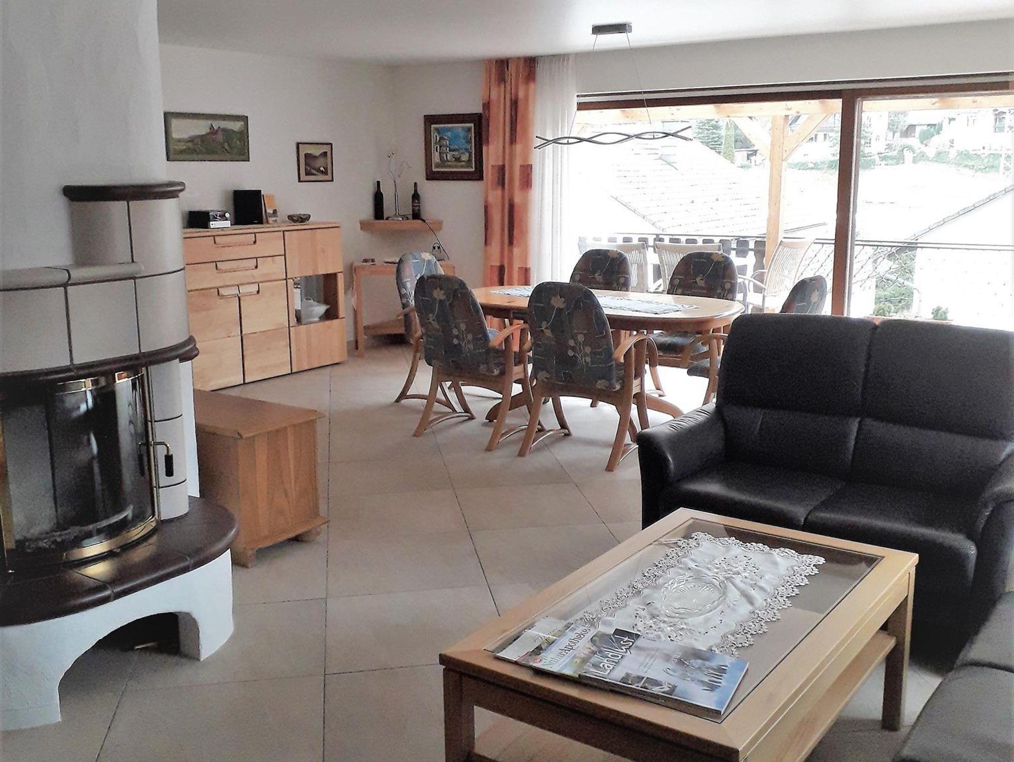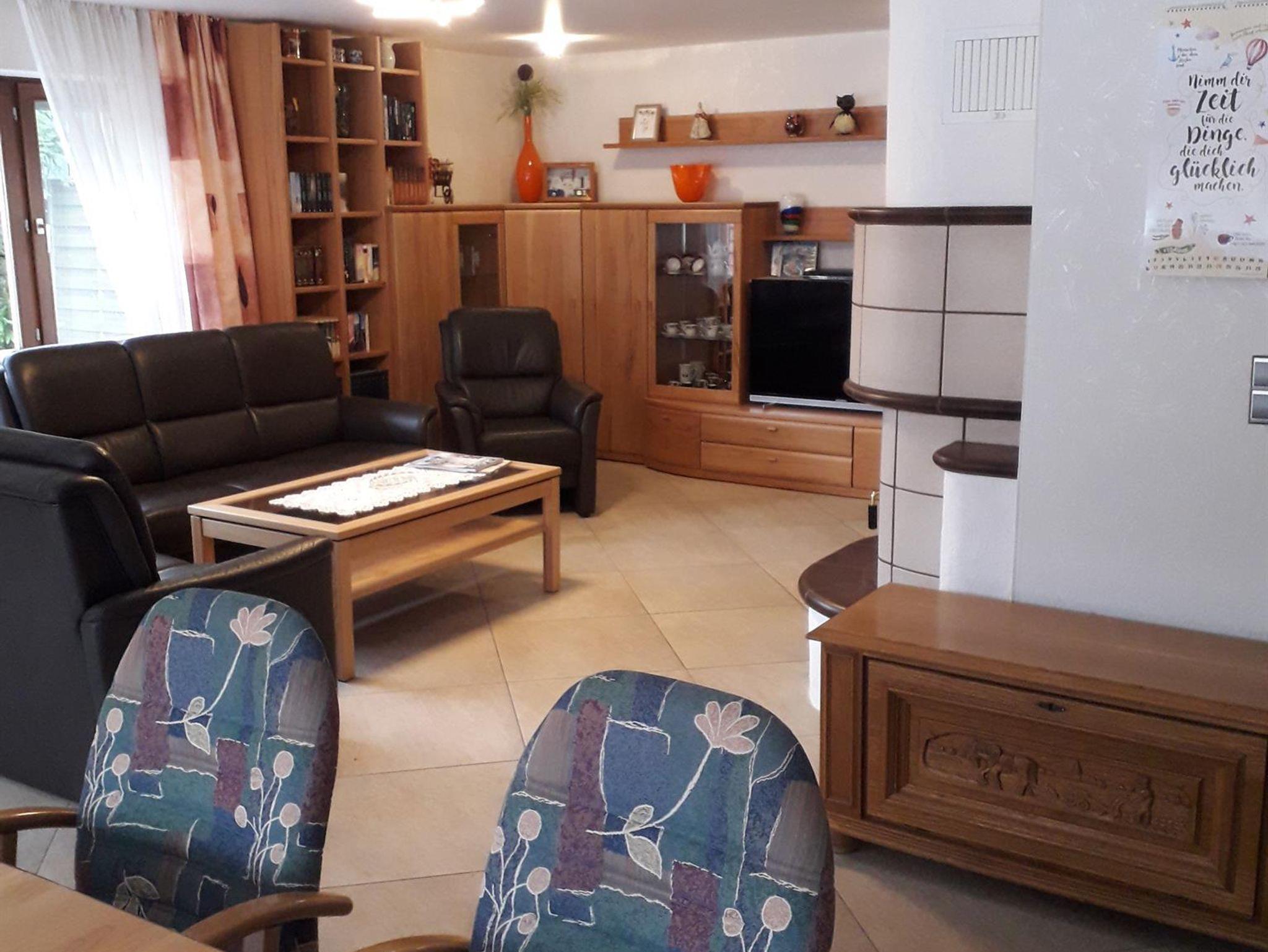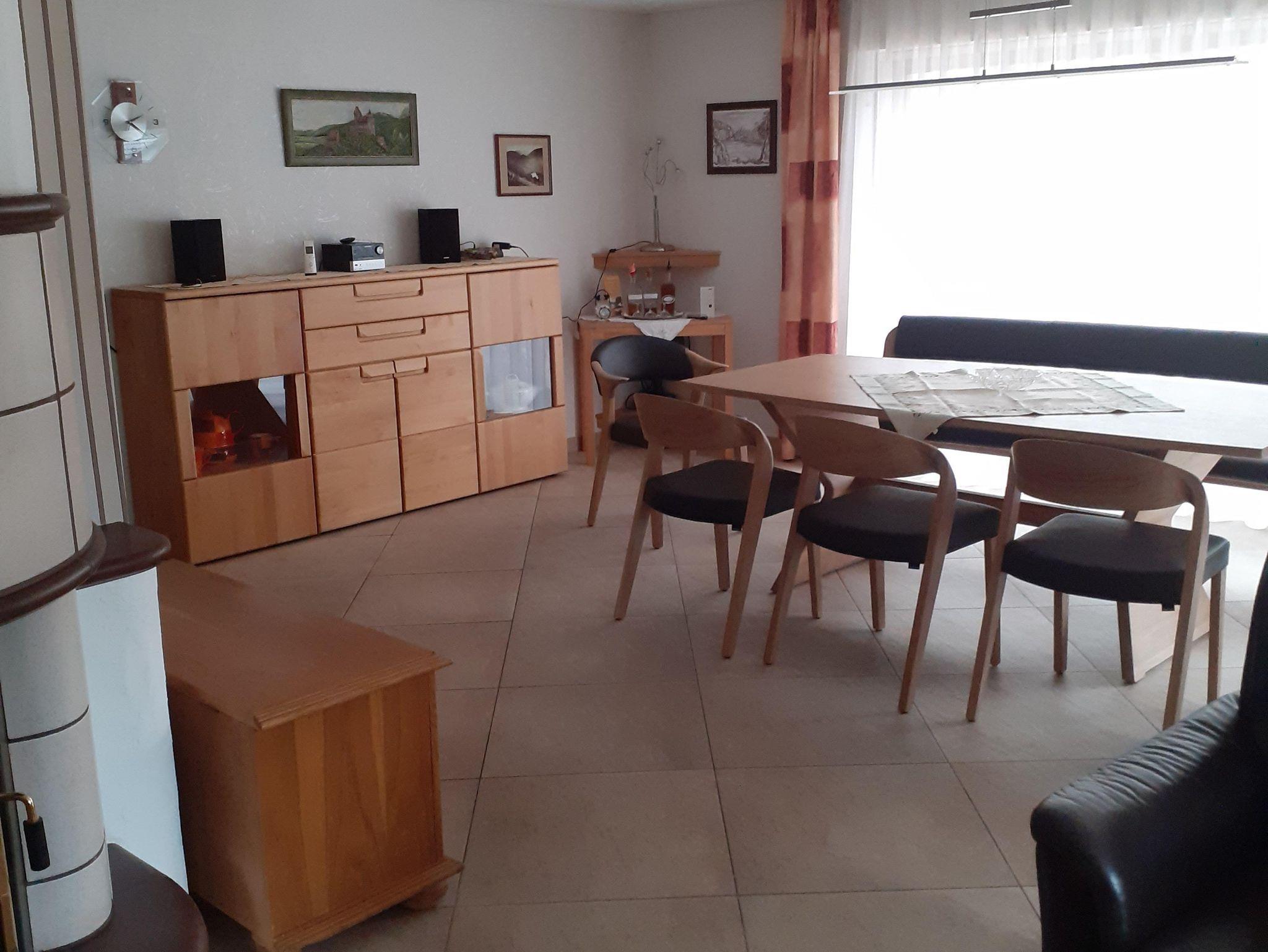 Unsere Ferienwohnung bietet auf 115 m² Platz für 6 Personen mit drei Schlafzimmern, Bad, Toilette, neuer komplett eingerichteter Küche einschließlich Geschirrspüler, Esszimmer, Wohnzimmer mit Ledersofa und gemütlichem Kachelkamin.