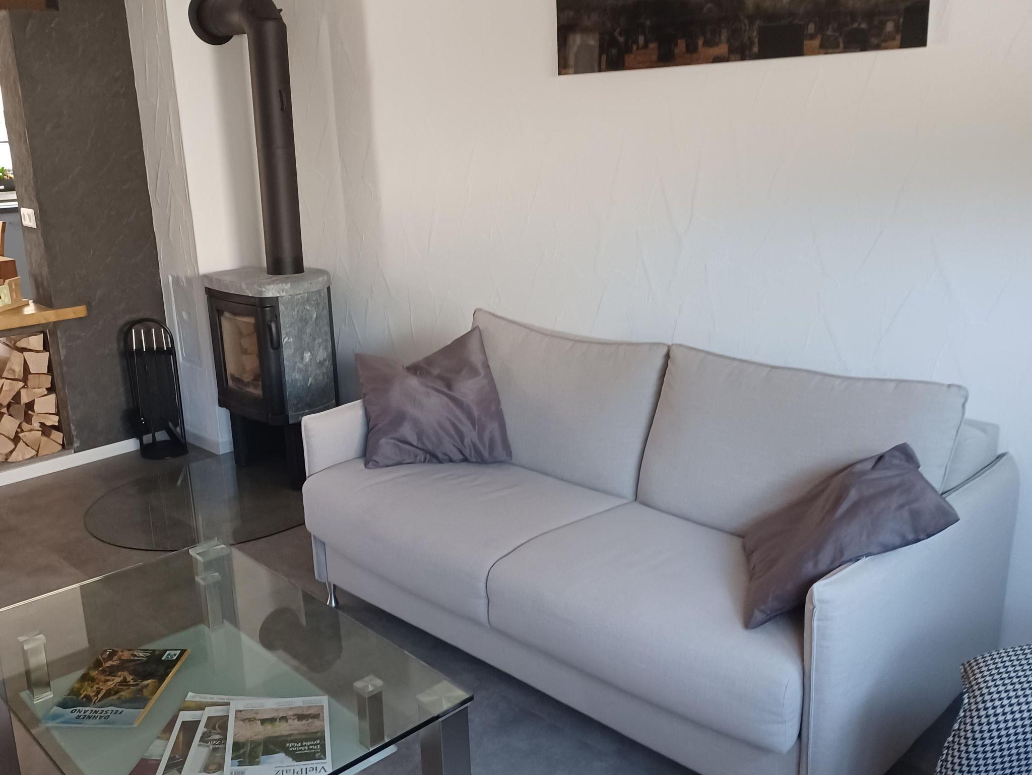 Im Wohnzimmer befindet sich eine Schlafcouch, ein Kaminofen sowie ein Fernseher.