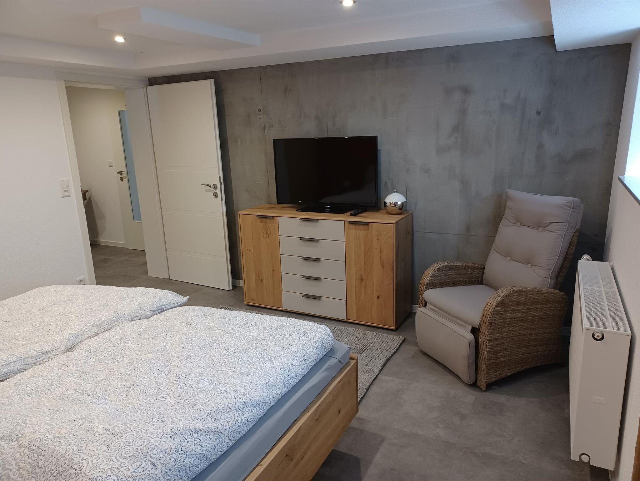 Das Schlafzimmer ist mit einem Doppelbett, Einbauschrank sowie TV ausgestattet. Ablagemöglichkeiten für Koffer und Kleidung ist ausreichend vorhanden.