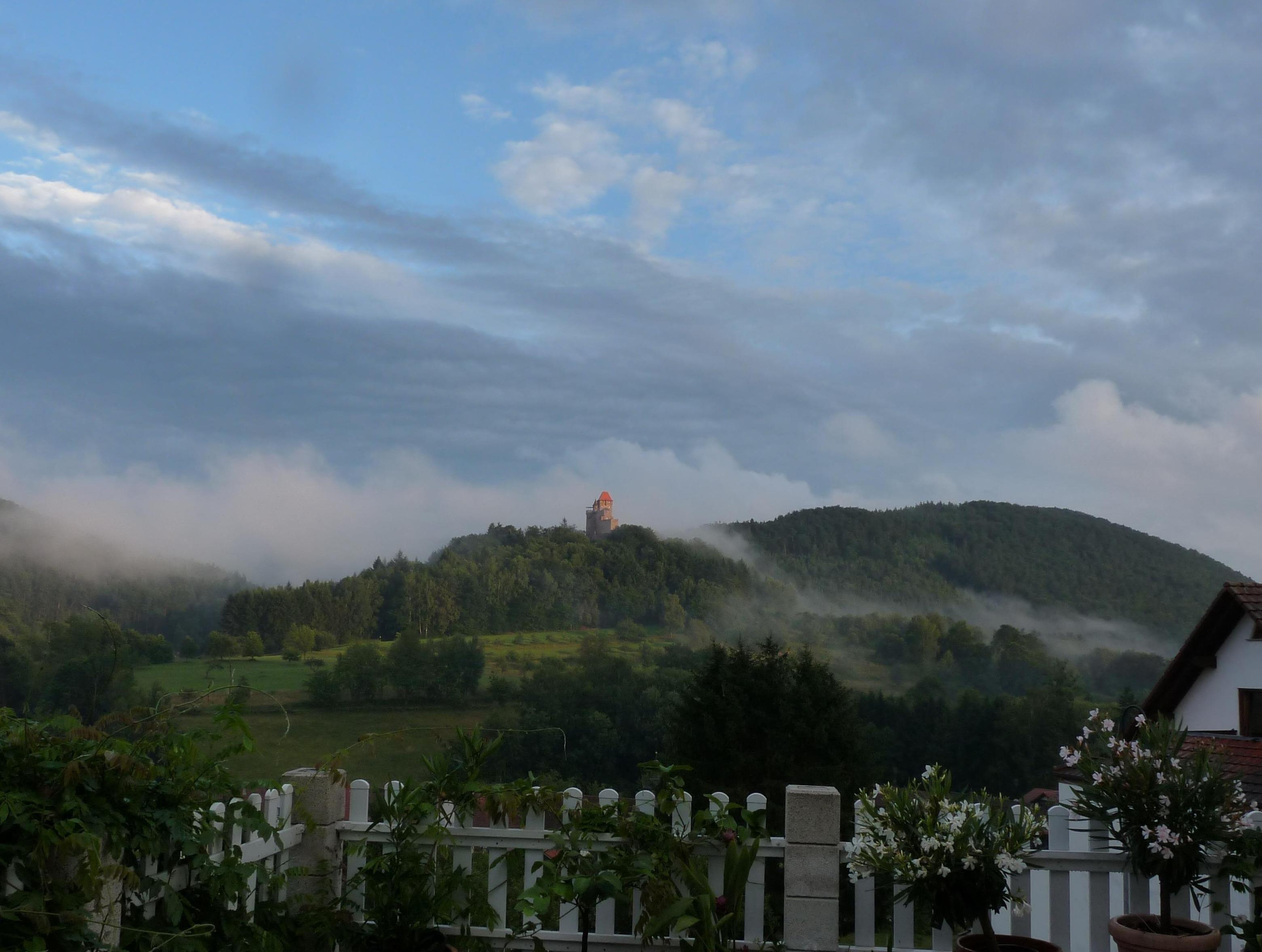 Fewo Monte Noble ruhig und naturnah wohnen mit einzigartiger Aussicht gegenüber Burg Berwartstein in Ortsrandlage von Erlenbach bei Dahn im Wasgau nahe Südliche Weinstraße im Dahner Felsenlandm Ausgangspunkt für Wanderungen, Radtouren und Badesee.