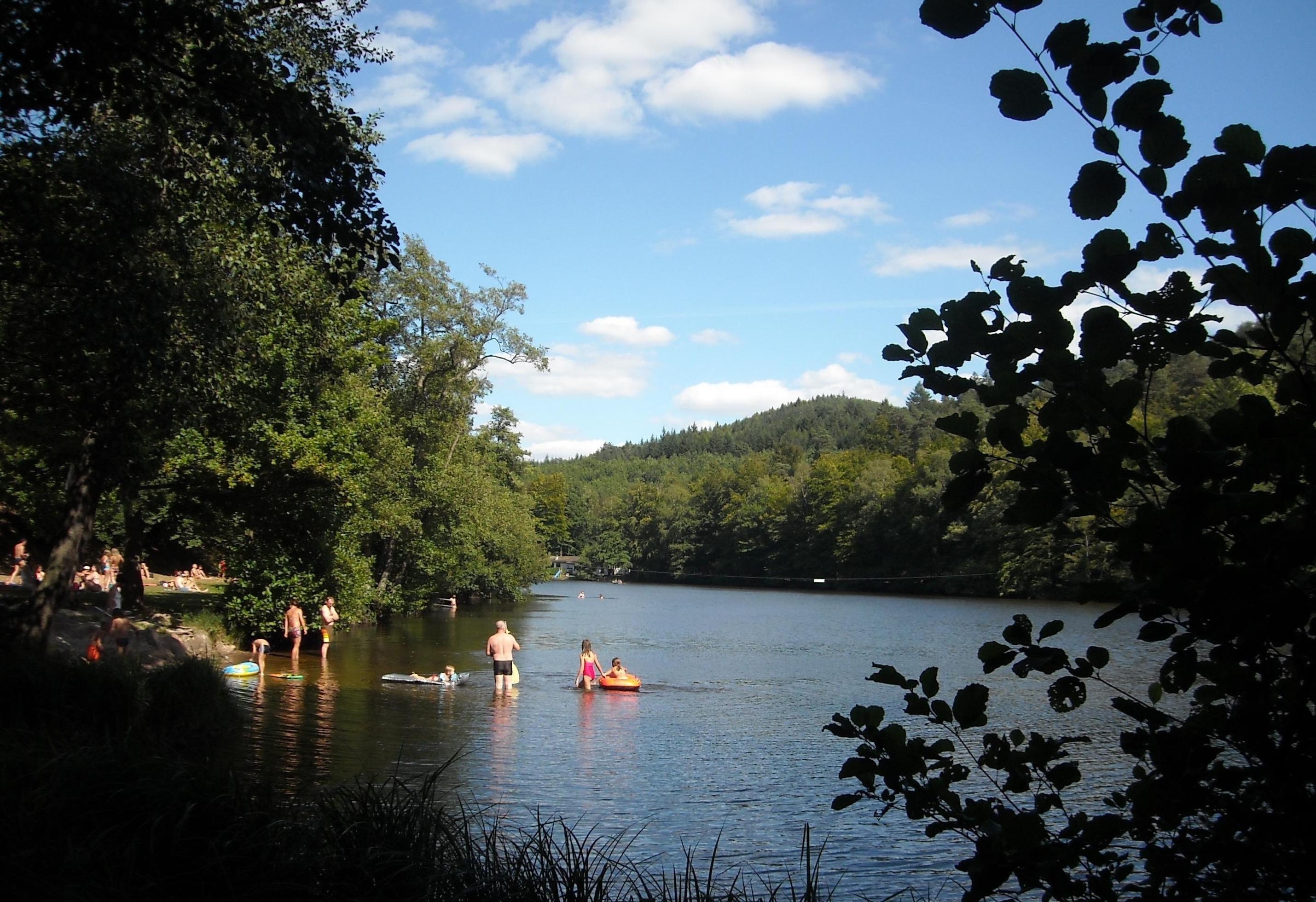 Badesee direkt am Ort,mit Gastronomie. Am See idyllischer ebenerdiger Rundweg, gefolgt von stillen Seen und Bachläufen, Wander-Ausgangspunkt, -