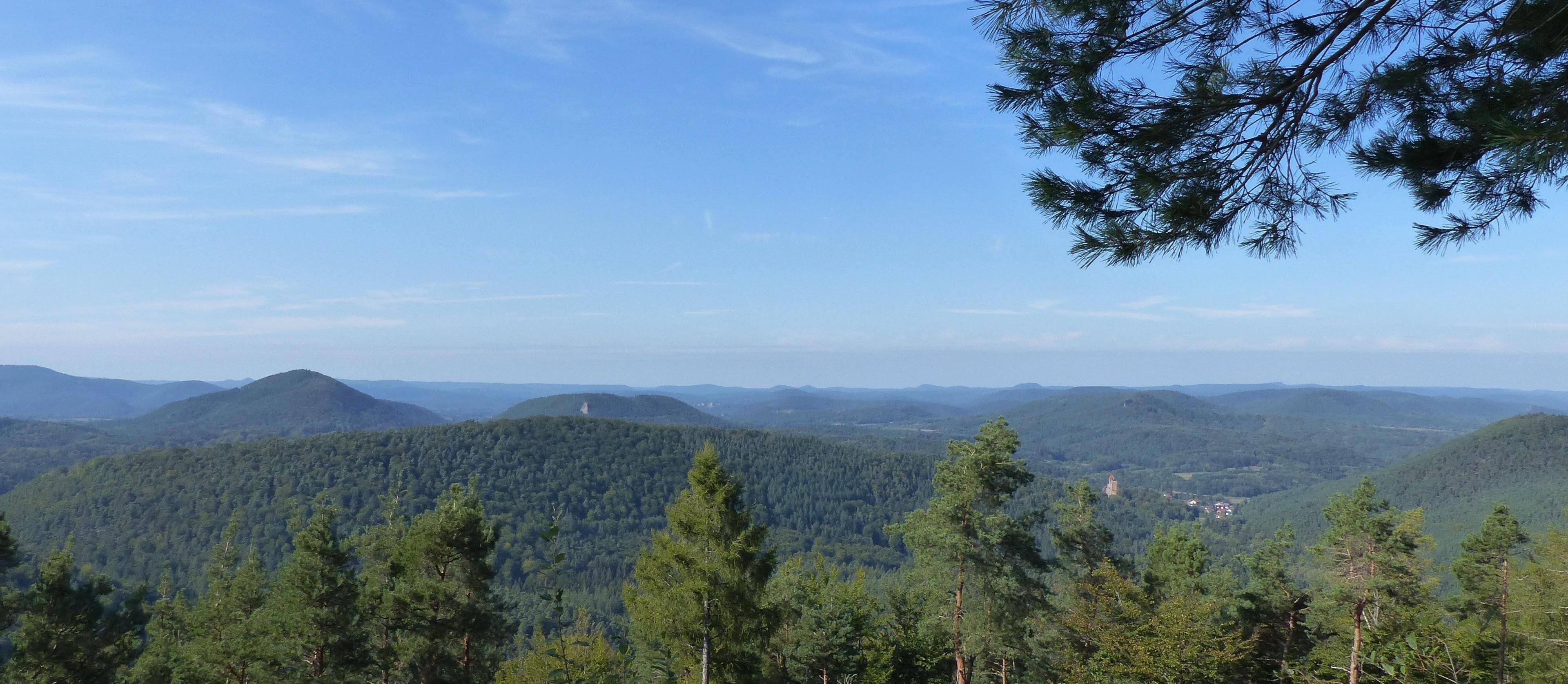 Sie erblicken die langestreckte wundervolle Pfälzer Berglandschaft. Sie schauen zudem auch in dieser Weite bis zu den französischen Vogesen.