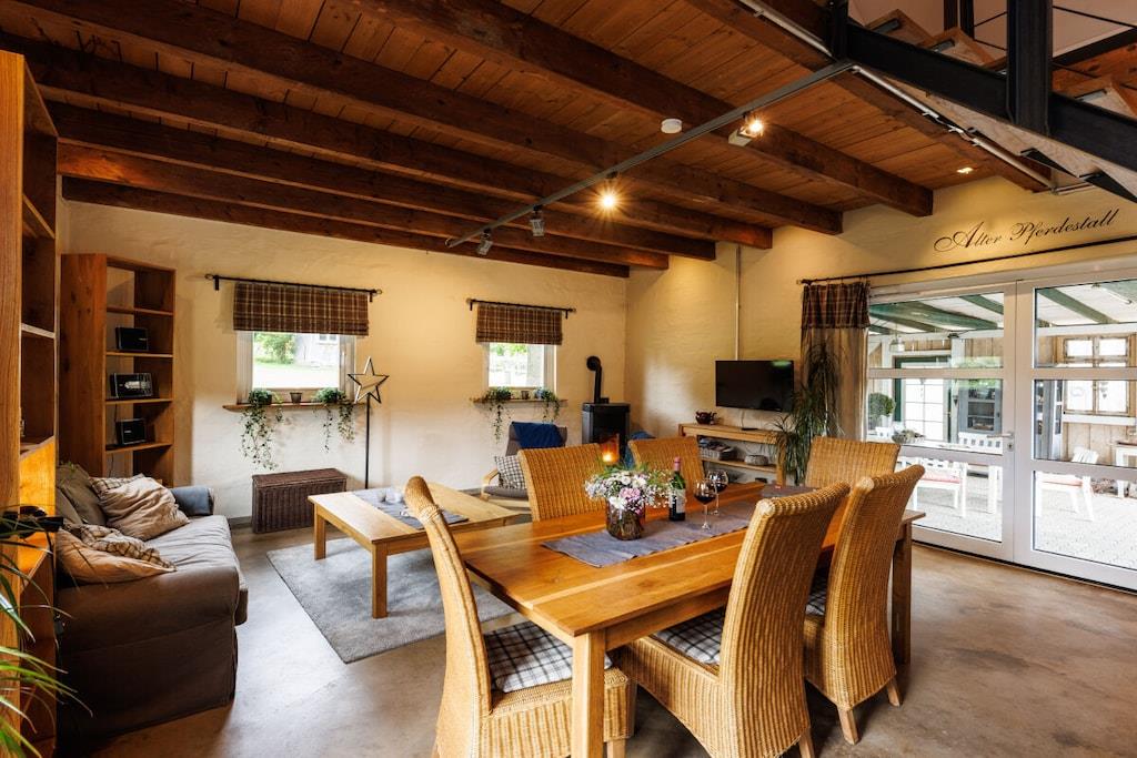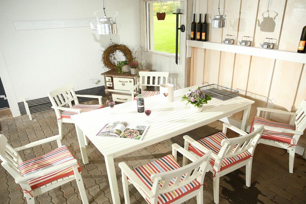 Stueetage: (Køkken(, , tekøkken, kogeplade, elkedel, brødrister, kaffemaskine, ovn, grill, mikrobølgeovn, opvaskemaskine , køleskab, fryser, varme), stue / spisestue(, , bibliotek, Fjernsyn, spisebord, kakkelovn, DVD-afspiller, radio, varme), badeværelse(, toilet, bruser, håndvask, varme)) På 1. etage: (soveværelse(, , dobbeltseng, Fjernsyn), soveværelse(, , dobbeltseng, Fjernsyn)) , , , svalegang soveværelse, Internetadgang, Internetadgang, Førstehjælp, varme, terrasse(Græsplæne, grill, havemøbler, solstole), strygebræt, strygejern, tørreskab,