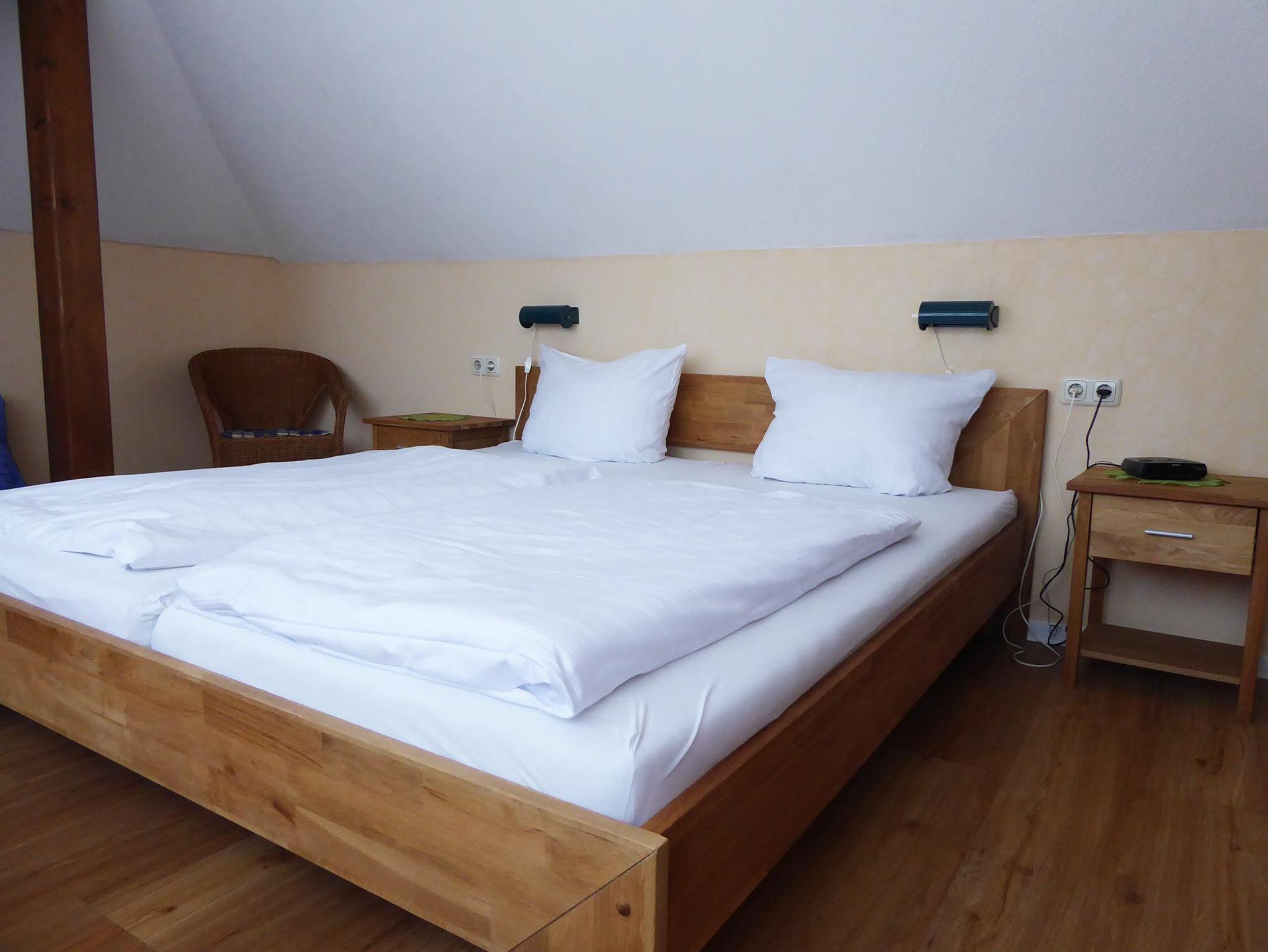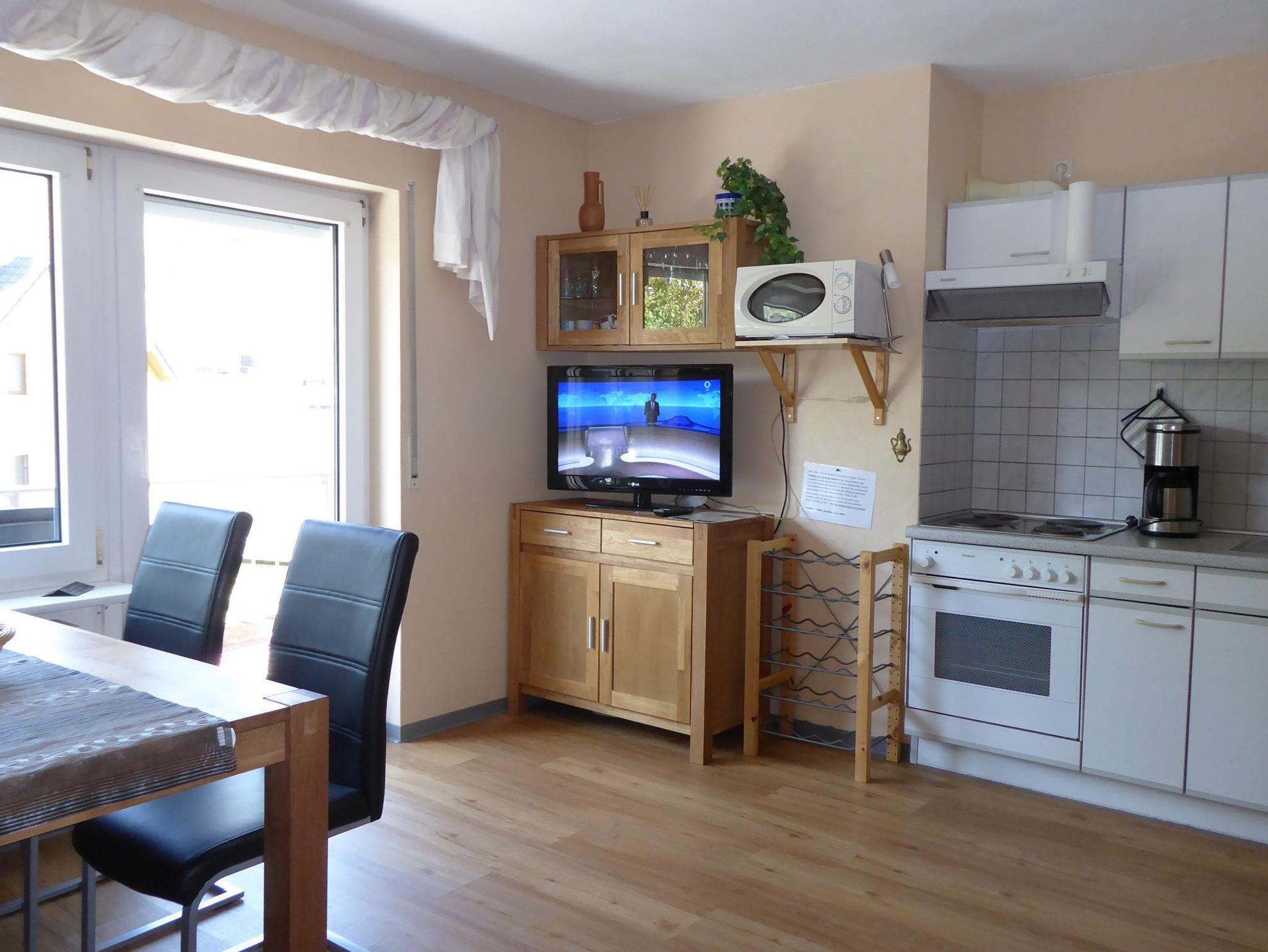 Fewo2: bis zu 4 Personen mit Schlafzimmer, Wohn-/Schlafraum mit Doppelbettcouch, komplett eingerichtete Küchenzeile mit Essplatz, Dusche/WC, Balkon.