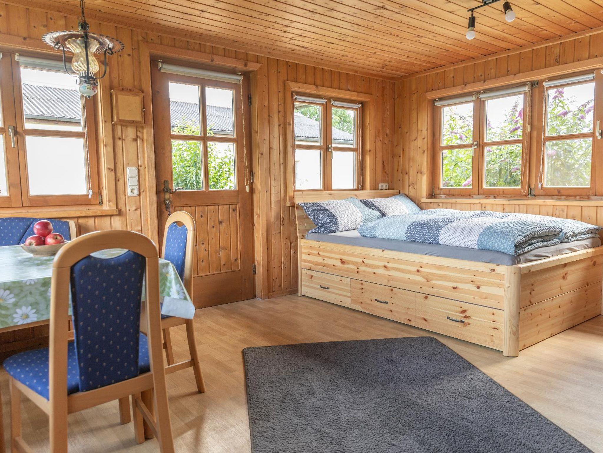 Schlicht und einfach Urlaub machen in unserer kleinen Ferienhütte ... wenn Sie Ruhe und Erholung suchen, preiswert und ohne großen Schnickschnack, dann sind Sie hier genau richtig. Die Hütte bietet in einem Doppelbett (2x1,40 m) Platz für 2 Personen. Auf Wunsch kann ein Klappbett oder Gitterbett dazu gestellt werden. Die Küche ist voll ausgestattet (Geschirr, Besteck, Töpfe, Kochplatte, Kühlschrank vorhanden). WC und Dusche (mit Fußbodenheizung) sind wenige Meter von der Hütte entfernt.