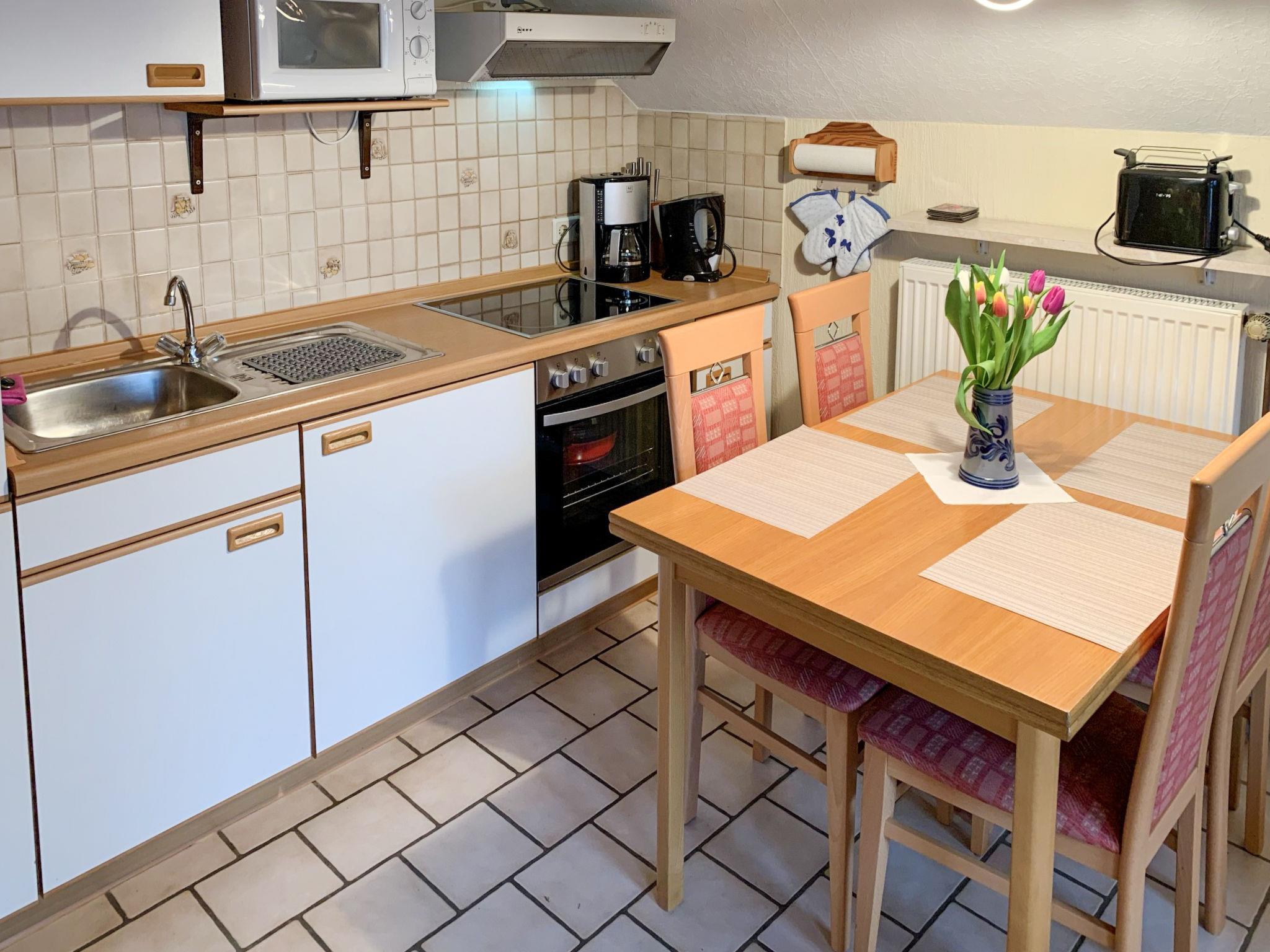 2-room apartment 45 m2, on the ground floor. Cosy and wooden furniture furnishings: living/dining room with satellite TV (flat screen), hi-fi system. Exit to the terrace. 1 room with 1 double bed (2 x 90 cm, length 200 cm). Kitchenette (oven, 4 ceramic glass hob hotplates, toaster, kettle, microwave, electric coffee machine). Shower/WC. Terrace furniture, barbecue (portable). Facilities: Internet (WiFi, free). Please note: non-smokers only. Smoke alarm.