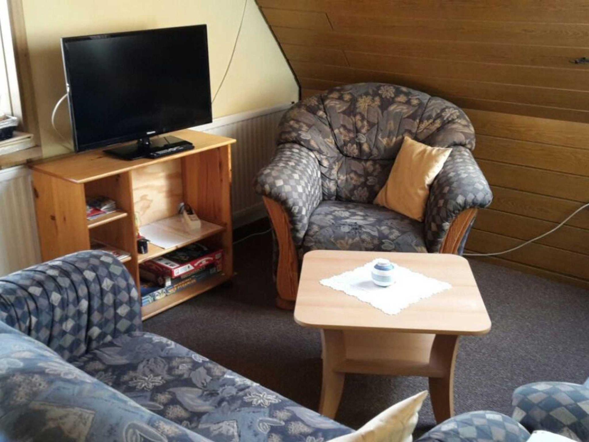 Das Wohnzimmer ist ausgestattet mit einer Couch und zwei Sesseln, Essecke , Flachbildschirm und Radio.